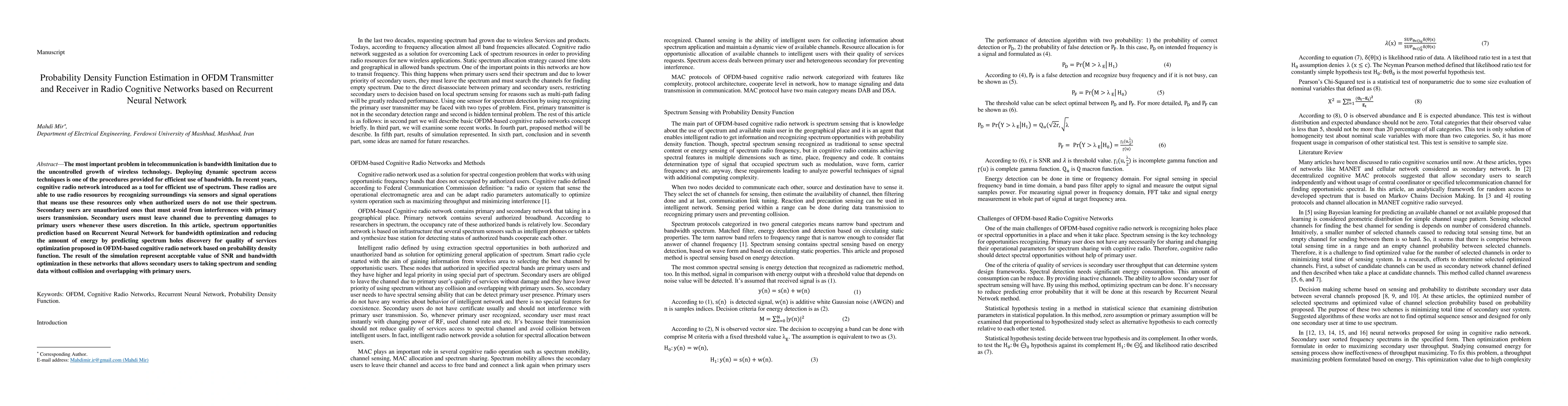 The most important problem in telecommunication is bandwidth limitation due to the uncontrolled growth of wireless technology. Deploying dynamic spectrum access techniques is one of the procedures provided for efficient use of bandwidth. In recent years, cognitive radio network introduced as a tool for efficient use of spectrum. These radios are able to use radio resources by recognizing surroundings via sensors and signal operations that means use these resources only when authorized users do not use their spectrum. Secondary users are unauthorized ones that must avoid from interferences with primary users transmission. Secondary users must leave channel due to preventing damages to primary users whenever these users discretion. In this article, spectrum opportunities prediction based on Recurrent Neural Network for bandwidth optimization and reducing the amount of energy by predicting spectrum holes discovery for quality of services optimization proposed in OFDM-based cognitive radio network based on probability density function. The result of the simulation represent acceptable value of SNR and bandwidth optimization in these networks that allows secondary users to taking spectrum and sending data without collision and overlapping with primary users.