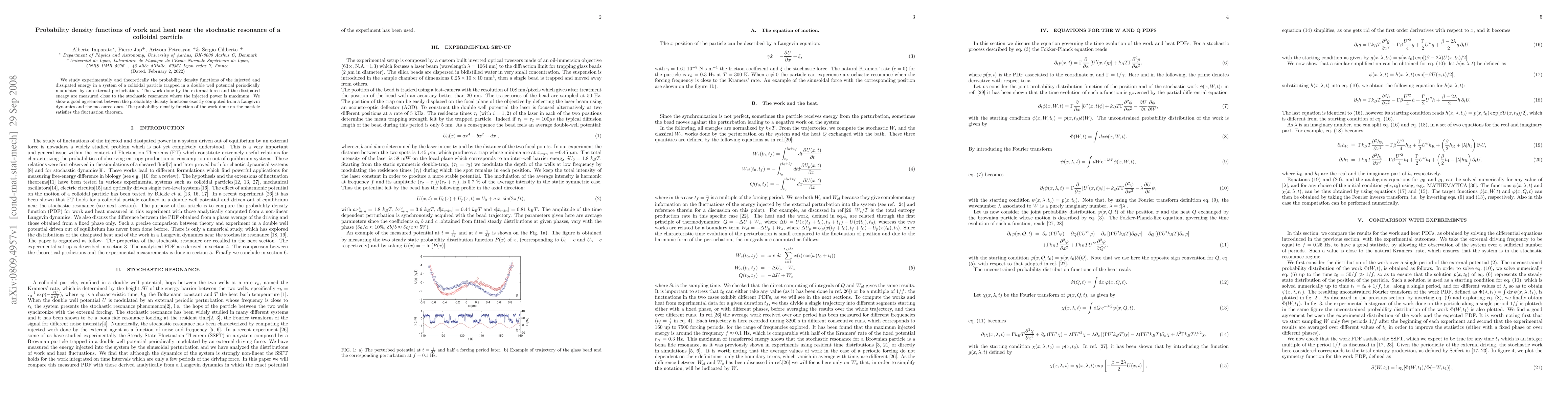 We study experimentally and theoretically the probability density functions of the injected and dissipated energy in a system of a colloidal particle trapped in a double well potential periodically modulated by an external perturbation. The work done by the external force and the dissipated energy are measured close to the stochastic resonance where the injected power is maximum. We show a good agreement between the probability density functions exactly computed from a Langevin dynamics and the measured ones. The probability density function of the work done on the particle satisfies the fluctuation theorem.
