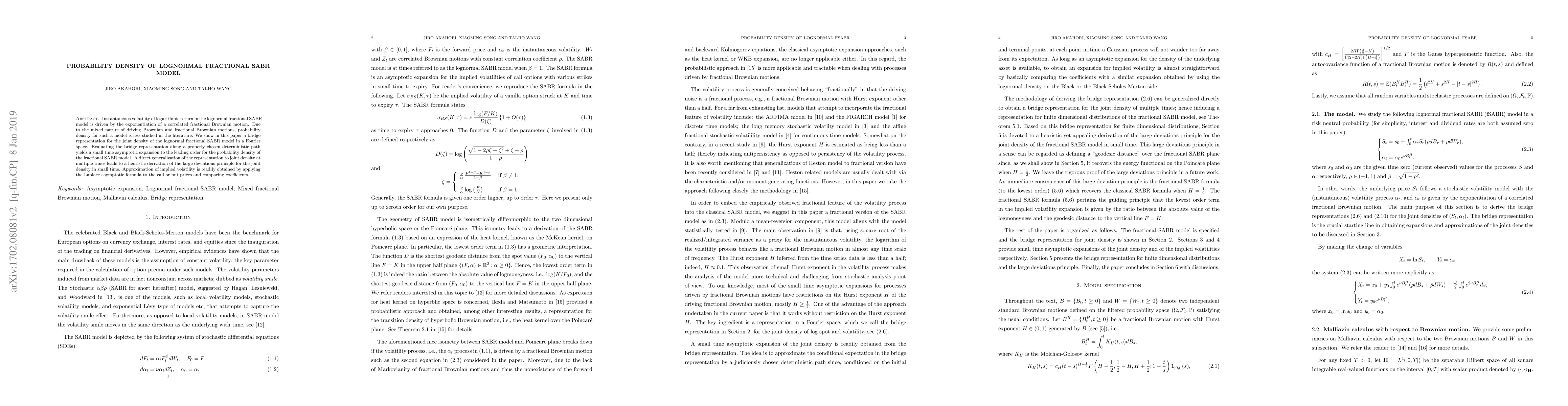 Instantaneous volatility of logarithmic return in the lognormal fractional SABR model is driven by the exponentiation of a correlated fractional Brownian motion. Due to the mixed nature of driving Brownian and fractional Brownian motions, probability density for such a model is less studied in the literature. We show in this paper a bridge representation for the joint density of the lognormal fractional SABR model in a Fourier space. Evaluating the bridge representation along a properly chosen deterministic path yields a small time asymptotic expansion to the leading order for the probability density of the fractional SABR model. A direct generalization of the representation to joint density at multiple times leads to a heuristic derivation of the large deviations principle for the joint density in small time. Approximation of implied volatility is readily obtained by applying the Laplace asymptotic formula to the call or put prices and comparing coefficients.