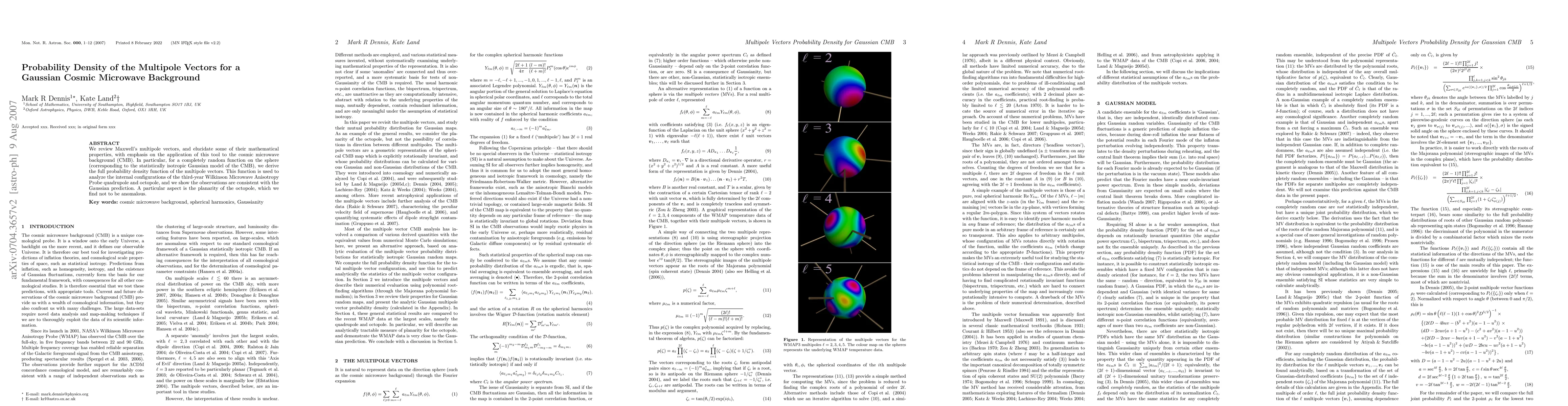This paper derives the probability density function for Maxwell's multipole vectors applied to the Gaussian cosmic microwave background (CMB). It finds that the Wilkinson Microwave Anisotropy Probe's quadrupole and octopole observations align with the Gaussian model, particularly noting the non-anomalous planarity of the octopole.