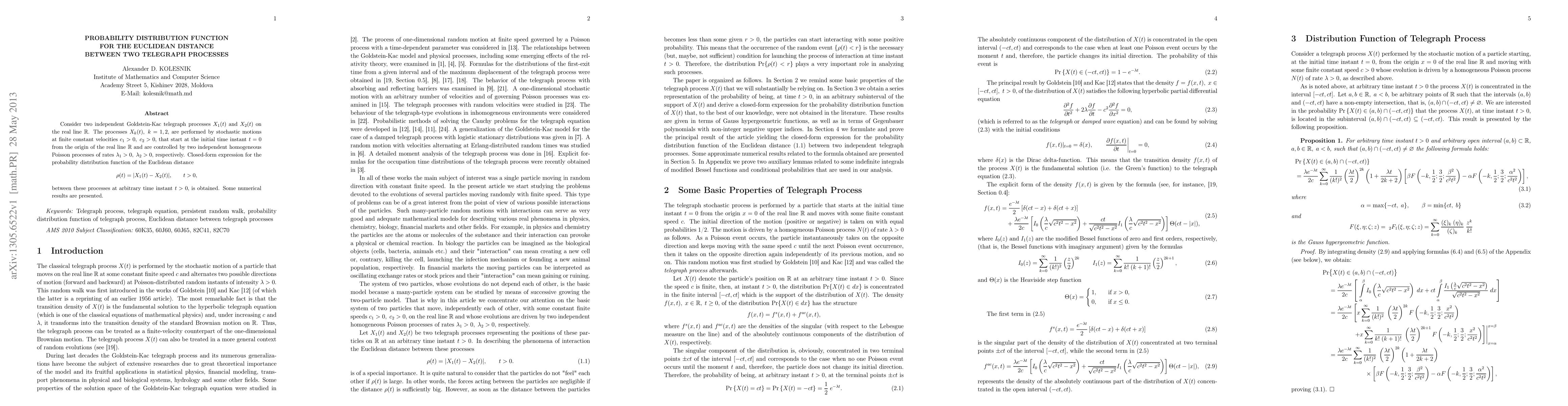 Consider two independent Goldstein-Kac telegraph processes $X_1(t)$ and $X_2(t)$ on the real line $\Bbb R$. The processes $X_k(t), \; k=1,2,$ are performed by stochastic motions at finite constant velocities $c_1>0, \; c_2>0,$ that start at the initial time instant $t=0$ from the origin of the real line $\Bbb R$ and are controlled by two independent homogeneous Poisson processes of rates $\lambda_1>0, \; \lambda_2>0$, respectively. Closed-form expression for the probability distribution function of the Euclidean distance $$\rho(t) = |X_1(t) - X_2(t) |, \qquad t>0,$$ between these processes at arbitrary time instant $t>0$, is obtained. Some numerical results are presented.