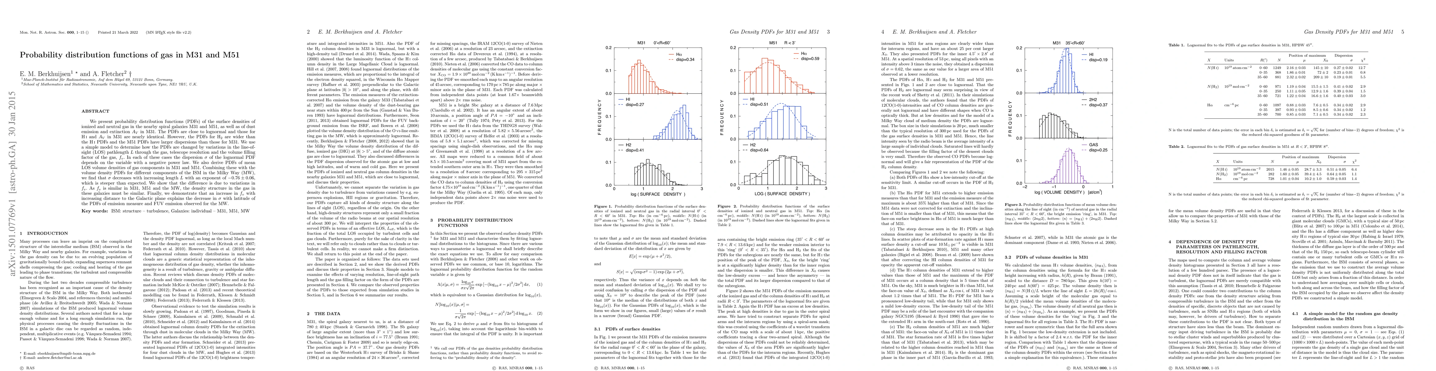We present probability distribution functions (PDFs) of the surface densities of ionized and neutral gas in the nearby spiral galaxies M31 and M51, as well as of dust emission and extinction Av in M31. The PDFs are close to lognormal and those for HI and Av in M31 are nearly identical. However, the PDFs for H2 are wider than the HI PDFs and the M51 PDFs have larger dispersions than those for M31. We use a simple model to determine how the PDFs are changed by variations in the line-of-sight (LOS) pathlength L through the gas, telescope resolution and the volume filling factor of the gas, f_v. In each of these cases the dispersion sigma of the lognormal PDF depends on the variable with a negative power law. We also derive PDFs of mean LOS volume densities of gas components in M31 and M51. Combining these with the volume density PDFs for different components of the ISM in the Milky Way (MW), we find that sigma decreases with increasing length L with an exponent of -0.76 +/- 0.06, which is steeper than expected. We show that the difference is due to variations in f_v. As f_v is similar in M31, M51 and the MW, the density structure in the gas in these galaxies must be similar. Finally, we demonstrate that an increase in f_v with increasing distance to the Galactic plane explains the decrease in sigma with latitude of the PDFs of emission measure and FUV emission observed for the MW.