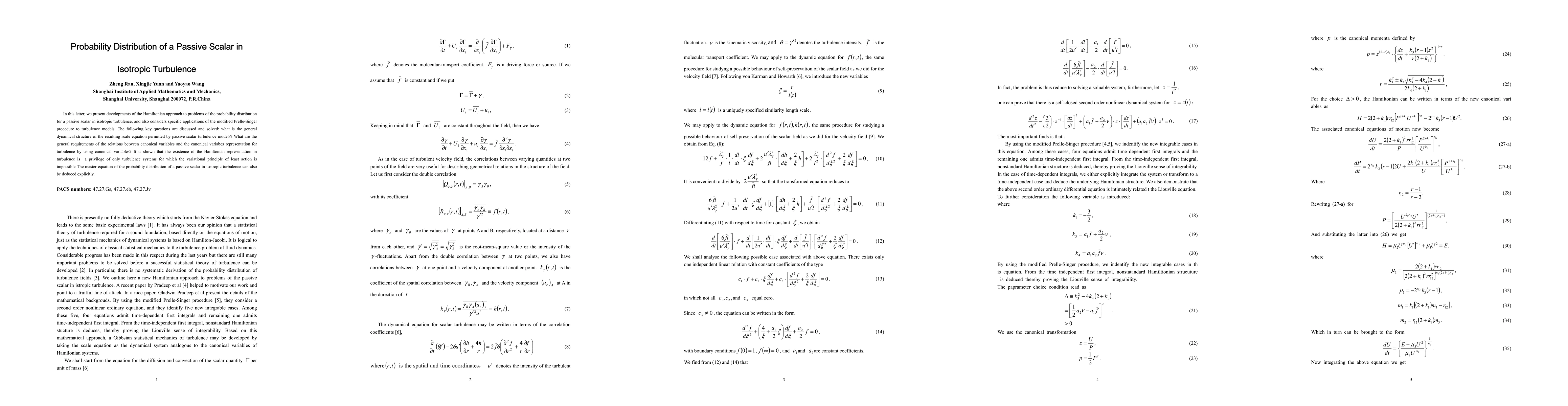 The research uses a Hamiltonian approach to problems of probability distribution for a passive scalar in isotropic turbulence.