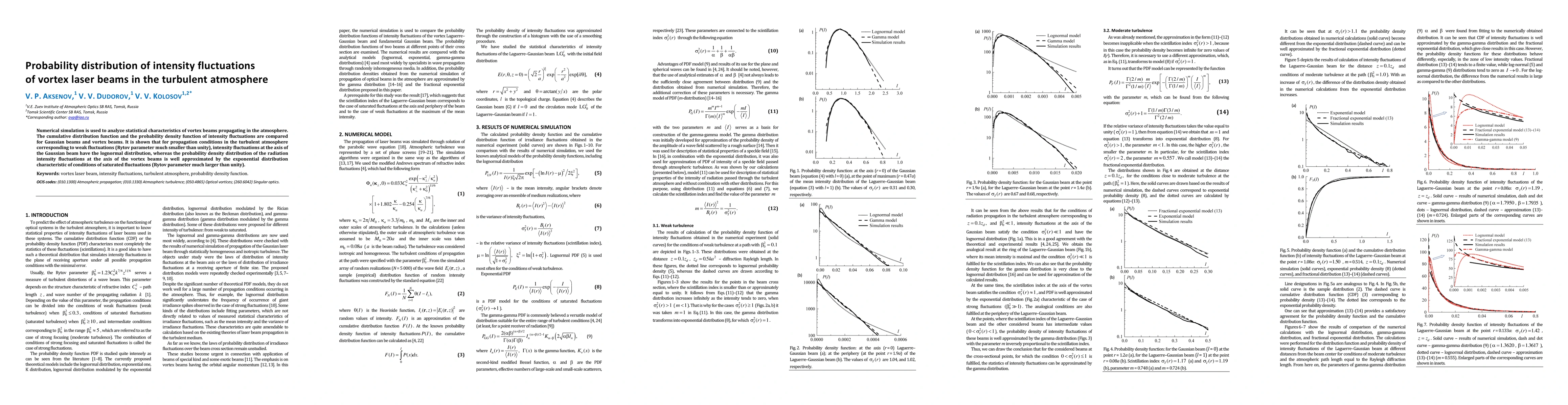 Numerical simulation is used to analyze statistical characteristics of vortex beams propagating in the atmosphere. The cumulative distribution function and the probability density function of intensity fluctuations are compared for Gaussian beams and vortex beams. It is shown that for propagation conditions in the turbulent atmosphere corresponding to weak fluctuations (Rytov parameter much smaller than unity), intensity fluctuations at the axis of the Gaussian beam have the lognormal distribution, whereas the probability density distribution of the radiation intensity fluctuations at the axis of the vortex beams is well approximated by the exponential distribution characteristic of conditions of saturated fluctuations (Rytov parameter much larger than unity)