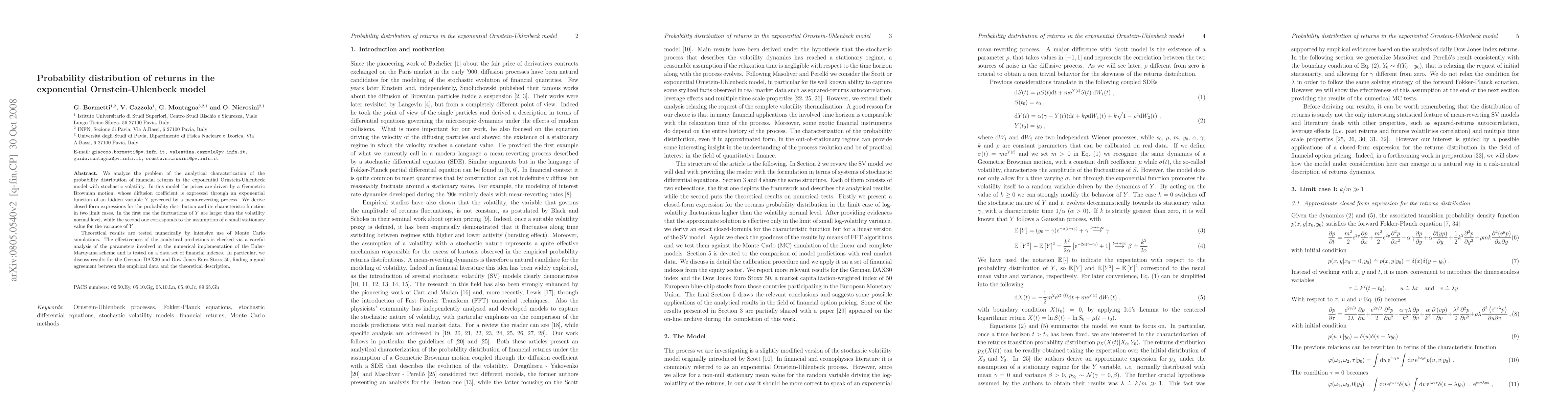 We analyze the problem of the analytical characterization of the probability distribution of financial returns in the exponential Ornstein-Uhlenbeck model with stochastic volatility. In this model the prices are driven by a Geometric Brownian motion, whose diffusion coefficient is expressed through an exponential function of an hidden variable Y governed by a mean-reverting process. We derive closed-form expressions for the probability distribution and its characteristic function in two limit cases. In the first one the fluctuations of Y are larger than the volatility normal level, while the second one corresponds to the assumption of a small stationary value for the variance of Y. Theoretical results are tested numerically by intensive use of Monte Carlo simulations. The effectiveness of the analytical predictions is checked via a careful analysis of the parameters involved in the numerical implementation of the Euler-Maruyama scheme and is tested on a data set of financial indexes. In particular, we discuss results for the German DAX30 and Dow Jones Euro Stoxx 50, finding a good agreement between the empirical data and the theoretical description.