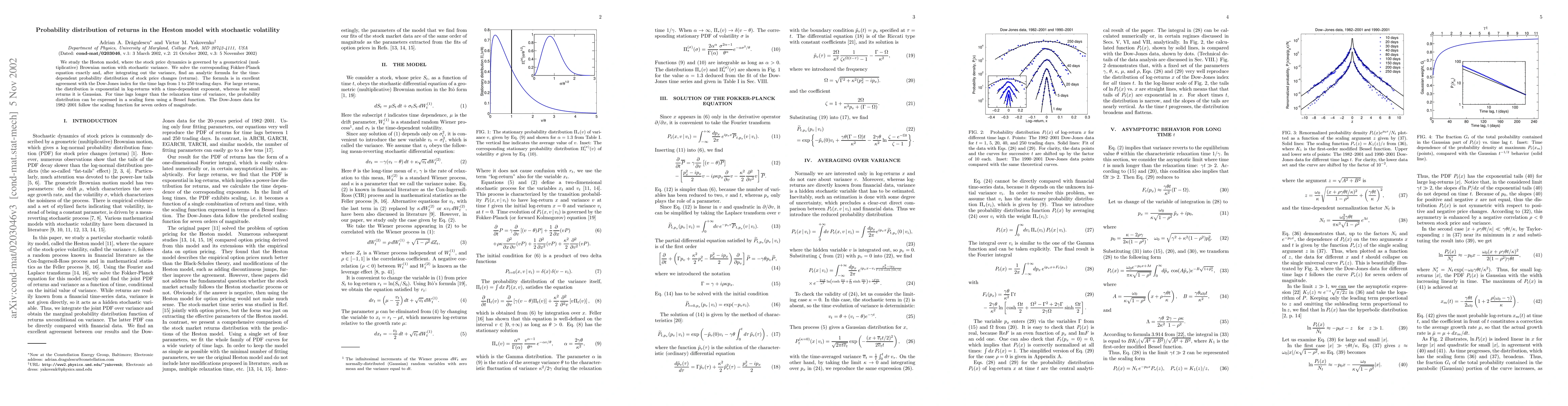 We study the Heston model, where the stock price dynamics is governed by a geometrical (multiplicative) Brownian motion with stochastic variance. We solve the corresponding Fokker-Planck equation exactly and, after integrating out the variance, find an analytic formula for the time-dependent probability distribution of stock price changes (returns). The formula is in excellent agreement with the Dow-Jones index for the time lags from 1 to 250 trading days. For large returns, the distribution is exponential in log-returns with a time-dependent exponent, whereas for small returns it is Gaussian. For time lags longer than the relaxation time of variance, the probability distribution can be expressed in a scaling form using a Bessel function. The Dow-Jones data for 1982-2001 follow the scaling function for seven orders of magnitude.
