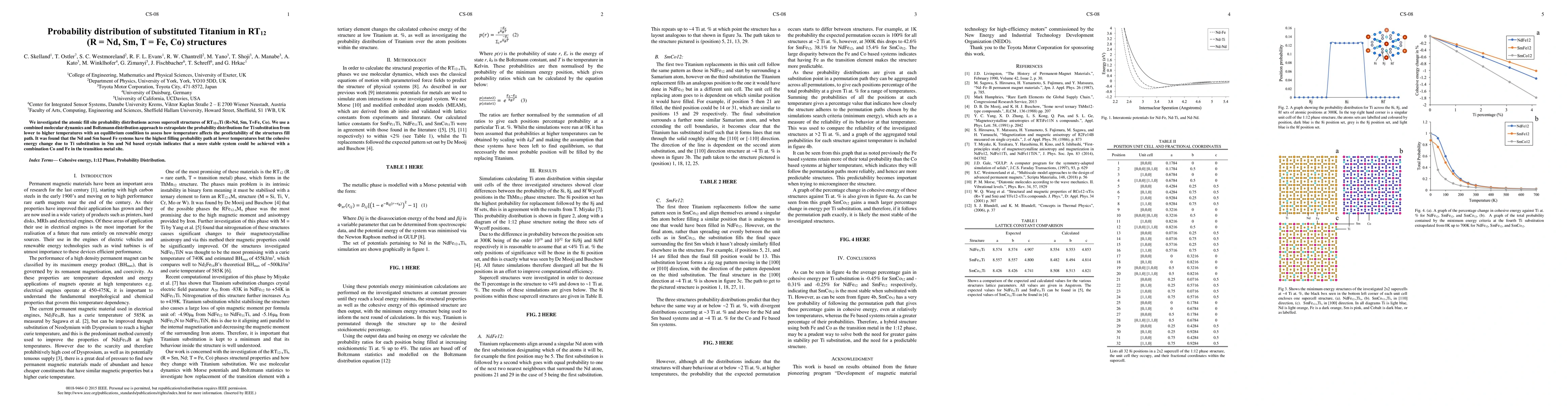 We investigated the atomic fill site probability distributions across supercell structures of RT12-xTi (R=Nd, Sm, T=Fe, Co). We use a combined molecular dynamics and Boltzmann distribution approach to extrapolate the probability distributions for Ti substitution from lower to higher temperatures with an equilibrium condition to assess how temperature affects the predictability of the structures fill path. It was found that the Nd and Sm based Fe systems have the highest filling probability path at lower temperatures but the cohesive energy change due to Ti substitution in Sm and Nd based crystals indicates that a more stable system could be achieved with a combination Co and Fe in the transition metal site.