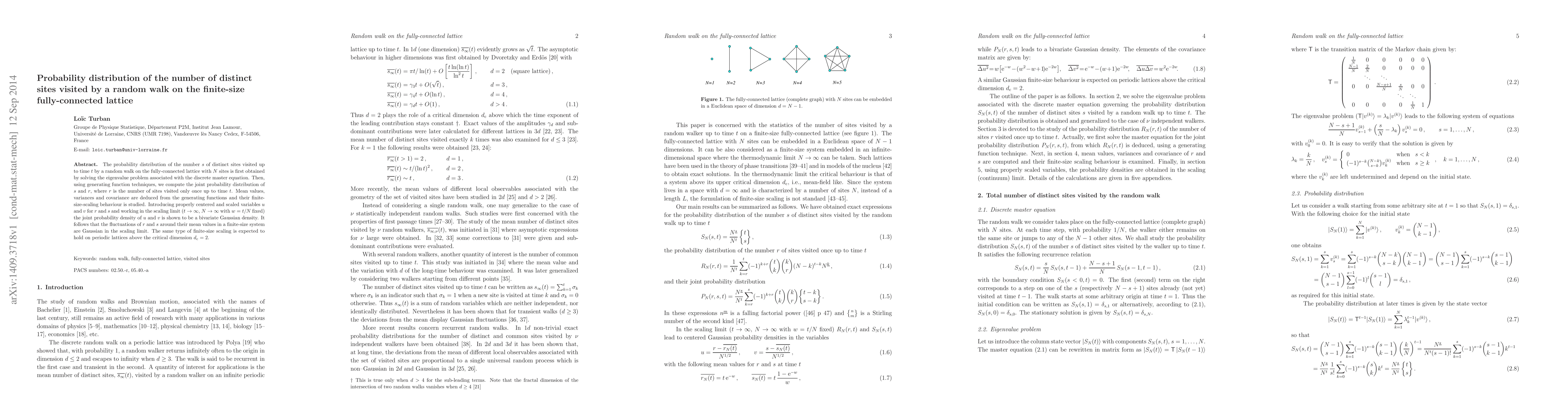 This paper derives the probability distribution for distinct sites visited by a random walk on a fully-connected lattice, solving the associated eigenvalue problem and employing generating functions. It reveals that in the scaling limit, the fluctuations of visited sites follow a bivariate Gaussian distribution.
