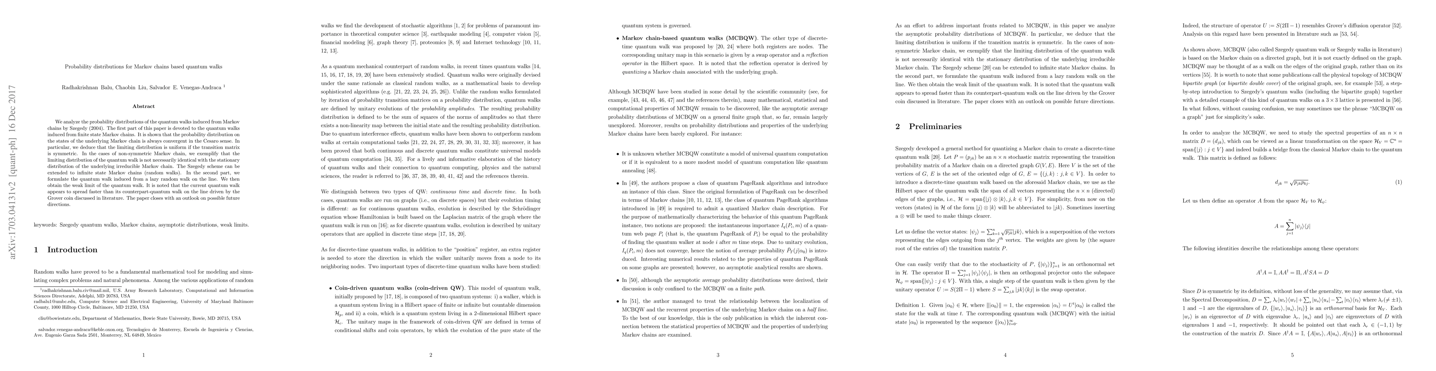 This paper investigates probability distributions in quantum walks derived from Markov chains, showing that these distributions converge in the Cesaro sense, with uniform limits for symmetric transition matrices. It contrasts quantum walk behaviors between symmetric and non-symmetric Markov chains and extends findings to infinite state random walks, noting faster spread compared to classical quantum walks.
