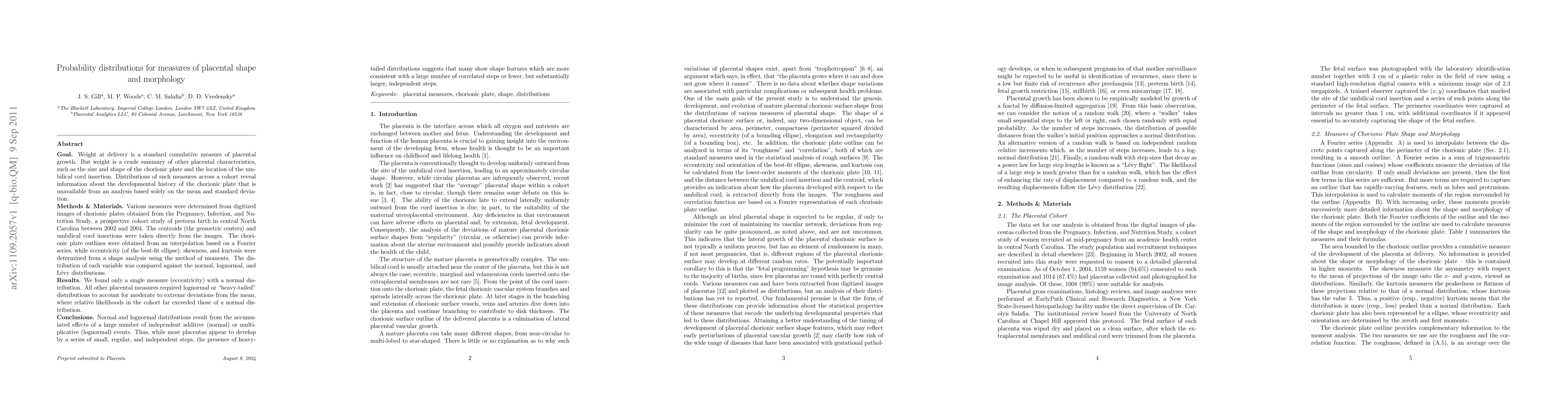 Weight at delivery is a standard cumulative measure of placental growth. But weight is a crude summary of other placental characteristics, such as the size and shape of the chorionic plate and the location of the umbilical cord insertion. Distributions of such measures across a cohort reveal information about the developmental history of the chorionic plate that is unavailable from an analysis based solely on the mean and standard deviation. Various measures were determined from digitized images of chorionic plates obtained from the Pregnancy, Infection, and Nutrition Study, a prospective cohort study of preterm birth in central North Carolina between 2002 and 2004. The centroids (the geometric centers) and umbilical cord insertions were taken directly from the images. The chorionic plate outlines were obtained from an interpolation based on a Fourier series, while eccentricity (of the best-fit ellipse), skewness, and kurtosis were determined from a shape analysis using the method of moments. The distribution of each variable was compared against the normal, lognormal, and Levy distributions. We found only a single measure (eccentricity) with a normal distribution. All other placental measures required lognormal or "heavy-tailed" distributions to account for moderate to extreme deviations from the mean, where relative likelihoods in the cohort far exceeded those of a normal distribution. Normal and lognormal distributions result from the accumulated effects of a large number of independent additive (normal) or multiplicative (lognormal) events. Thus, while most placentas appear to develop by a series of small, regular, and independent steps, the presence of heavy-tailed distributions suggests that many show shape features which are more consistent with a large number of correlated steps or fewer, but substantially larger, independent steps.