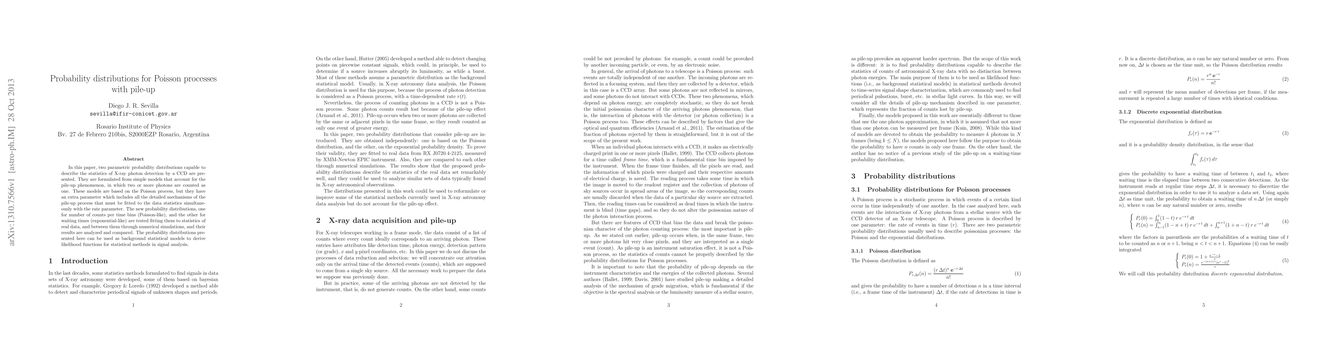 In this paper, two parametric probability distributions capable to describe the statistics of X-ray photon detection by a CCD are presented. They are formulated from simple models that account for the pile-up phenomenon, in which two or more photons are counted as one. These models are based on the Poisson process, but they have an extra parameter which includes all the detailed mechanisms of the pile-up process that must be fitted to the data statistics simultaneously with the rate parameter. The new probability distributions, one for number of counts per time bins (Poisson-like), and the other for waiting times (exponential-like) are tested fitting them to statistics of real data, and between them through numerical simulations, and their results are analyzed and compared. The probability distributions presented here can be used as background statistical models to derive likelihood functions for statistical methods in signal analysis.