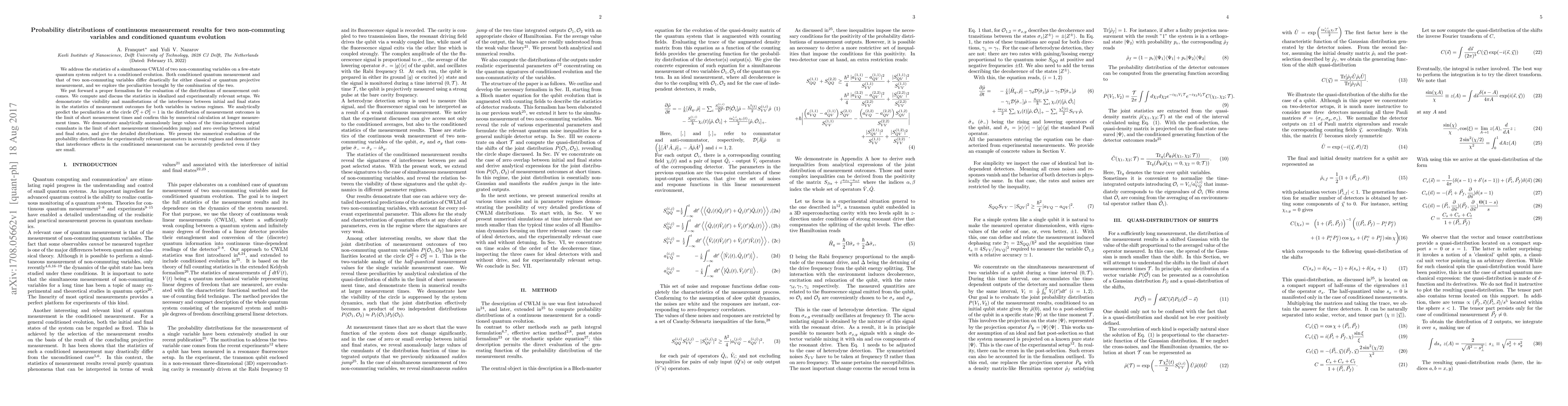 We address the statistics of a simultaneous CWLM of two non-commuting variables on a few-state quantum system subject to a conditioned evolution. Both conditioned quantum measurement and that of two non-commuting variables differ drastically for either classical or quantum projective measurement, and we explore the peculiarities brought by the combination of the two. We put forward a proper formalism for the evaluation of the distributions of measurement outcomes. We compute and discuss the statistics in idealized and experimentally relevant setups. We demonstrate the visibility and manifestations of the interference between initial and final states in the statistics of measurement outcomes for both variables in various regimes. We analytically predict the peculiarities at the circle ${\cal O}^2_1+{\cal O}^2_2=1$ in the distribution of measurement outcomes in the limit of short measurement times and confirm this by numerical calculation at longer measurement times. We demonstrate analytically anomalously large values of the time-integrated output cumulants in the limit of short measurement times(sudden jump) and zero overlap between initial and final states, and give the detailed distributions. We present the numerical evaluation of the probability distributions for experimentally relevant parameters in several regimes and demonstrate that interference effects in the conditioned measurement can be accurately predicted even if they are small.