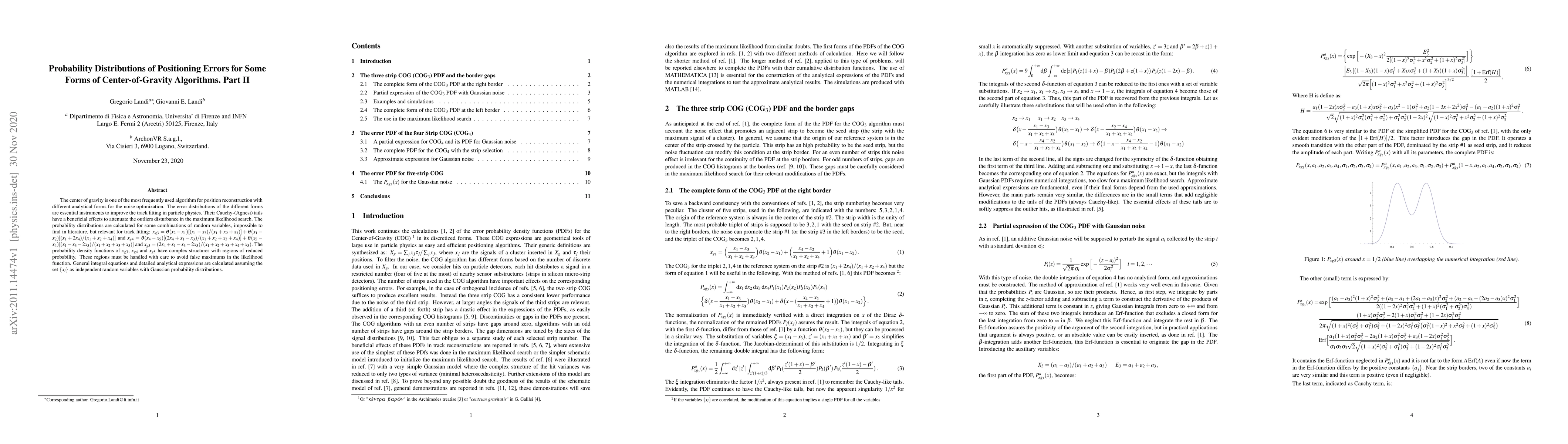 The center of gravity is one of the most frequently used algorithm for position reconstruction with different analytical forms for the noise optimization. The error distributions of the different forms are essential instruments to improve the track fitting in particle physics. Their Cauchy-(Agnesi) tails have a beneficial effects to attenuate the outliers disturbance in the maximum likelihood search. The probability distributions are calculated for some combinations of random variables, impossible to find in literature, but relevant for track fitting: $x_{g3}=\theta(x_2-x_1)[ (x_1-x_3)/(x_1+x_2+x_3)] + \theta(x_1-x_2)[(x_1+2x_4)/(x_1+x_2+x_4)]$ and $x_{g4}=\theta(x_4-x_5)[(2x_4+x_1-x_3)/(x_1+x_2+x_3+x_4)]+ \theta(x_5-x_4)[(x_1-x_3-2x_5)/(x_1+x_2+x_3+x_5)]$ and $x_{g5}=(2x_4+x_1-x_3-2x_5)/(x_1+x_2+x_3+x_4+x_5)$. The probability density functions of $x_{g3}$, $x_{g4}$ and $x_{g5}$ have complex structures with regions of reduced probability. These regions must be handled with care to avoid false maximums in the likelihood function. General integral equations and detailed analytical expressions are calculated assuming the set $\{x_i\}$ as independent random variables with Gaussian probability distributions. %