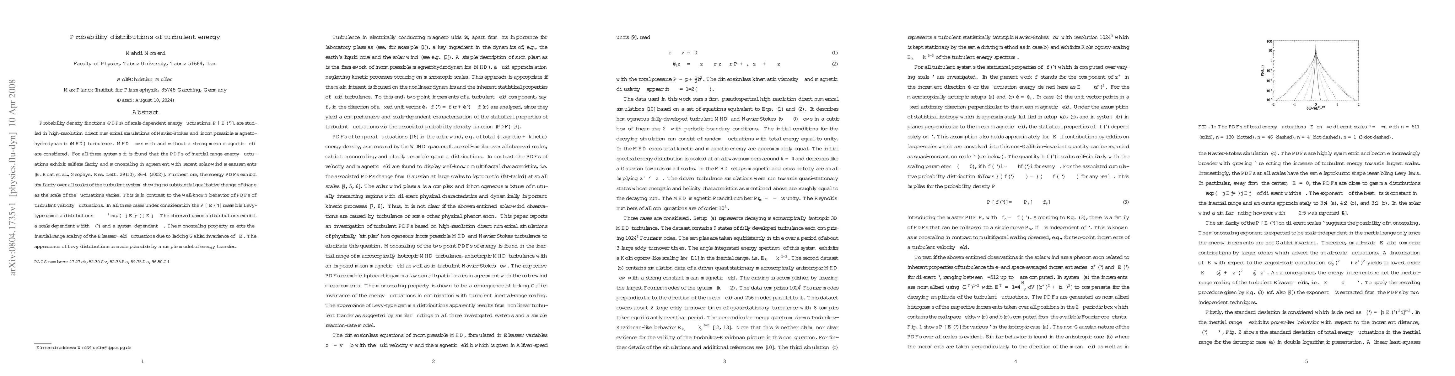 This study investigates the probability density functions of turbulent energy fluctuations in high-resolution simulations of Navier-Stokes and magnetohydrodynamic turbulence, revealing self-similar and monoscaling PDFs across scales. The energy PDFs resemble L\'evy-type gamma distributions, differing from the behavior of turbulent velocity fluctuations.
