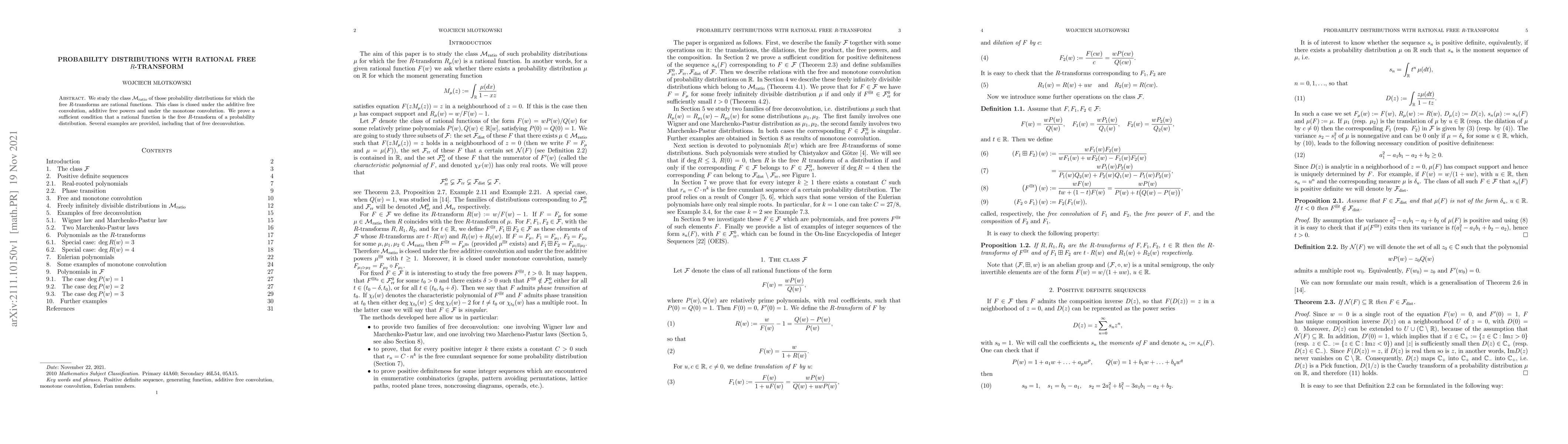 This paper investigates probability distributions with rational free $R$-transforms, showing that the class $\mathcal{M}_{\mathrm{ratio}}$ is closed under additive free convolution, additive free powers, and monotone convolution. The authors provide a sufficient condition for a rational function to be a free $R$-transform of a probability distribution and illustrate with examples, including free deconvolution.