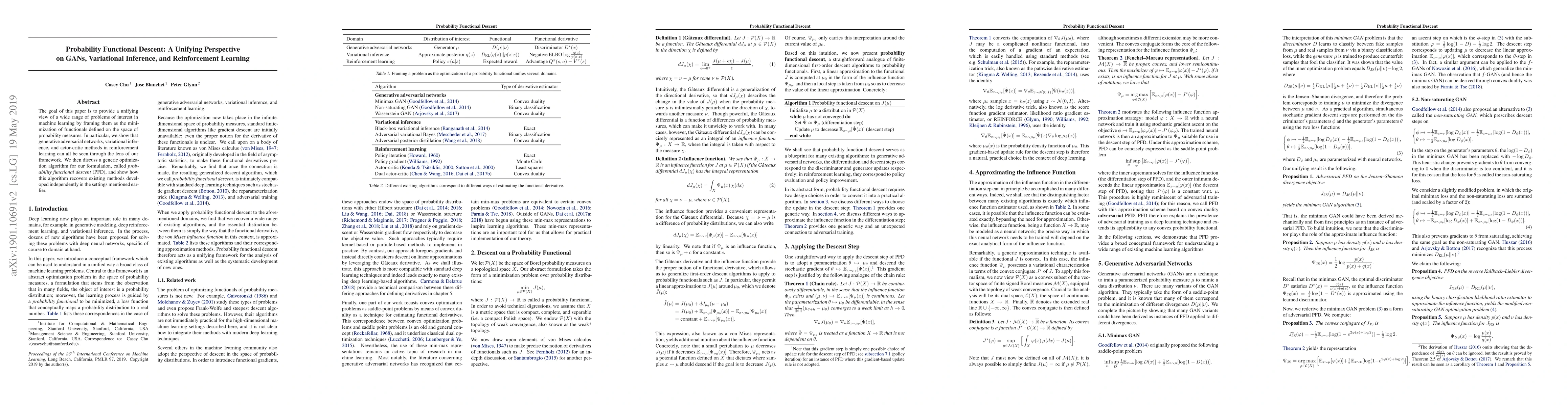 This paper unifies generative adversarial networks, variational inference, and reinforcement learning by framing them as minimization of functionals on probability measures. It introduces probability functional descent (PFD) as a generic optimization algorithm that recovers existing methods in these areas.