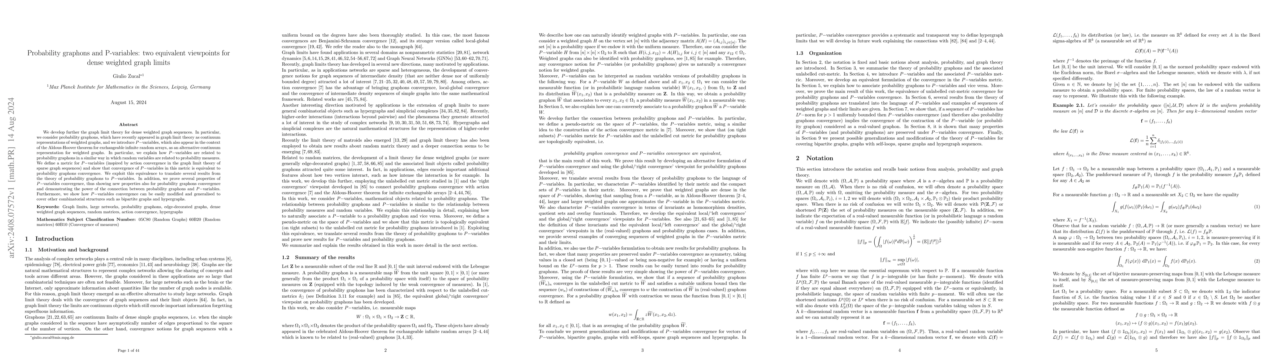 This paper explores dense weighted graph limit theory through two continuum representations: probability graphons and P-variables. It demonstrates the equivalence between P-variables and probability graphons, translating known results and proving new properties, while extending the concept to other combinatorial structures like bipartite graphs and hypergraphs.