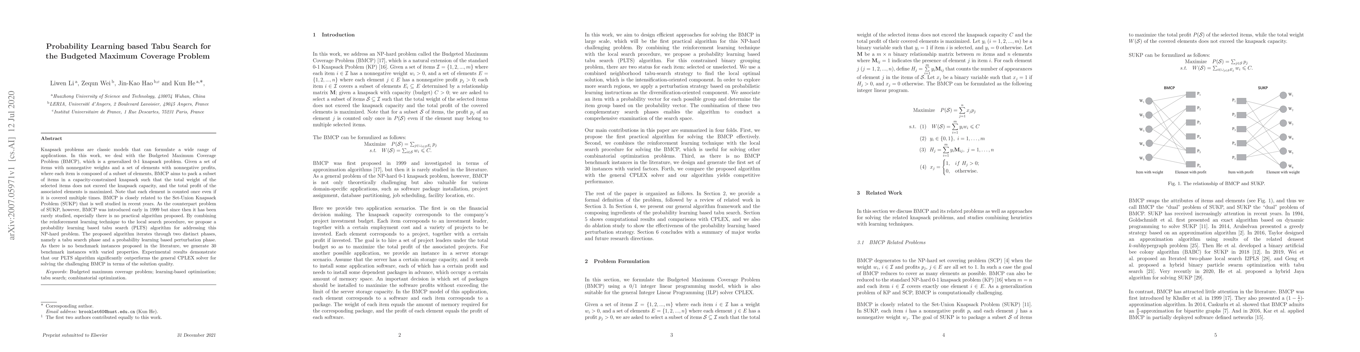 This paper proposes a probability learning based tabu search (PLTS) algorithm to tackle the Budgeted Maximum Coverage Problem (BMCP), a generalized 0-1 knapsack problem. The PLTS algorithm combines reinforcement learning with local search, outperforming the general CPLEX solver in experimental results, and generates 30 benchmark instances for further study.
