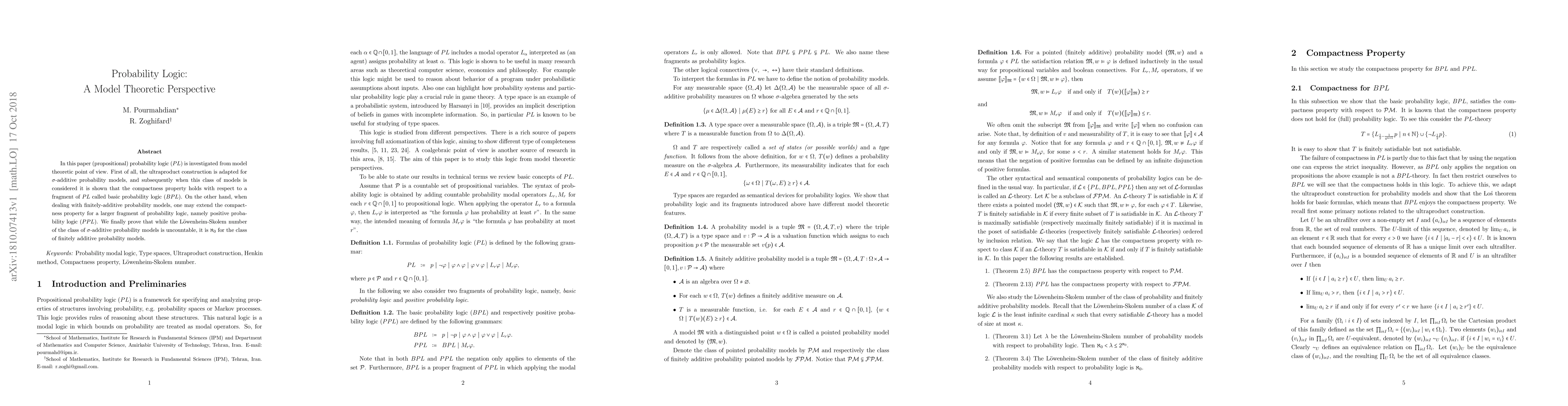 This paper explores propositional probability logic from a model theoretic perspective, demonstrating the compactness property for basic and positive probability logics in $\sigma$-additive and finitely-additive probability models. It also shows that the Löwenheim-Skolem number is uncountable for $\sigma$-additive models but countable for finitely-additive models.
