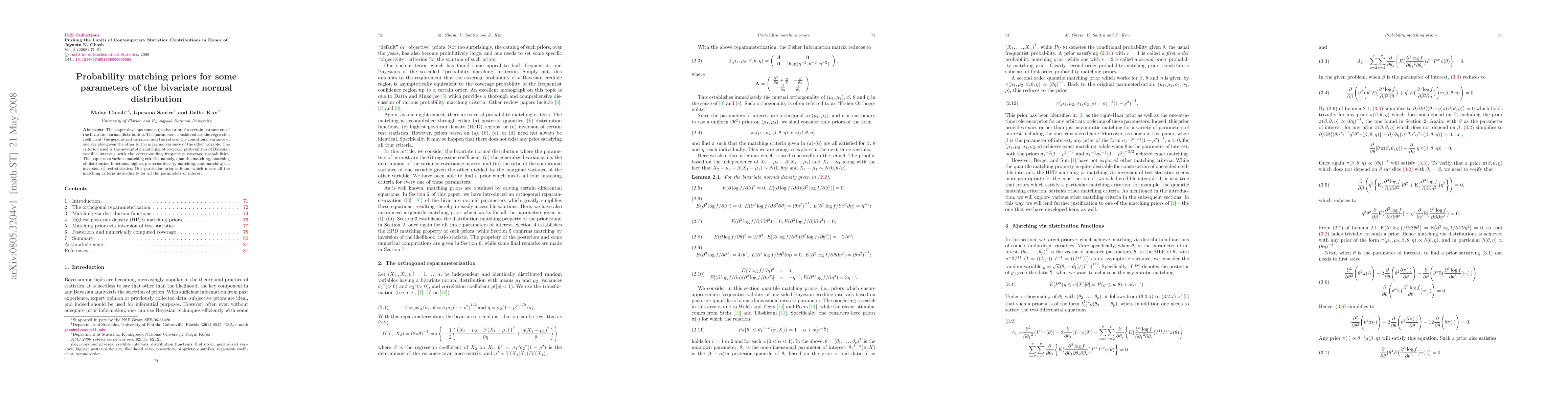 This paper proposes objective priors for parameters of the bivariate normal distribution, including regression coefficient, generalized variance, and conditional variance ratios, using criteria that match Bayesian and frequentist coverage probabilities. A specific prior is identified that satisfies all matching criteria for the parameters considered.