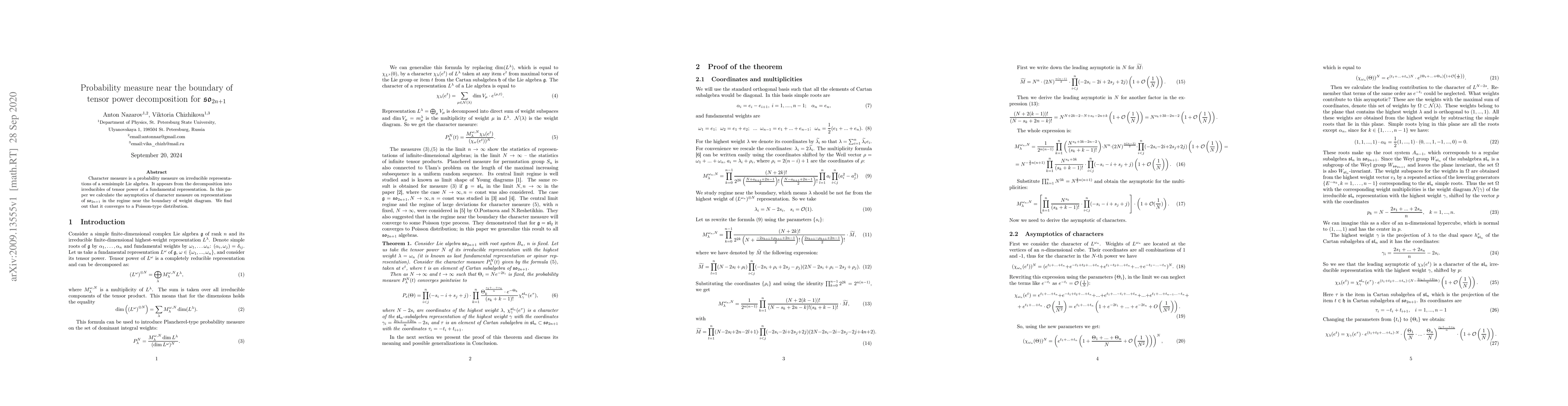 Character measure is a probability measure on irreducible representations of a semisimple Lie algebra. It appears from the decomposition into irreducibles of tensor power of a fundamental representation. In this paper we calculate the asymptotics of character measure on representations of so(2n+1) in the regime near the boundary of weight diagram. We find out that it converges to a Poisson-type distribution.