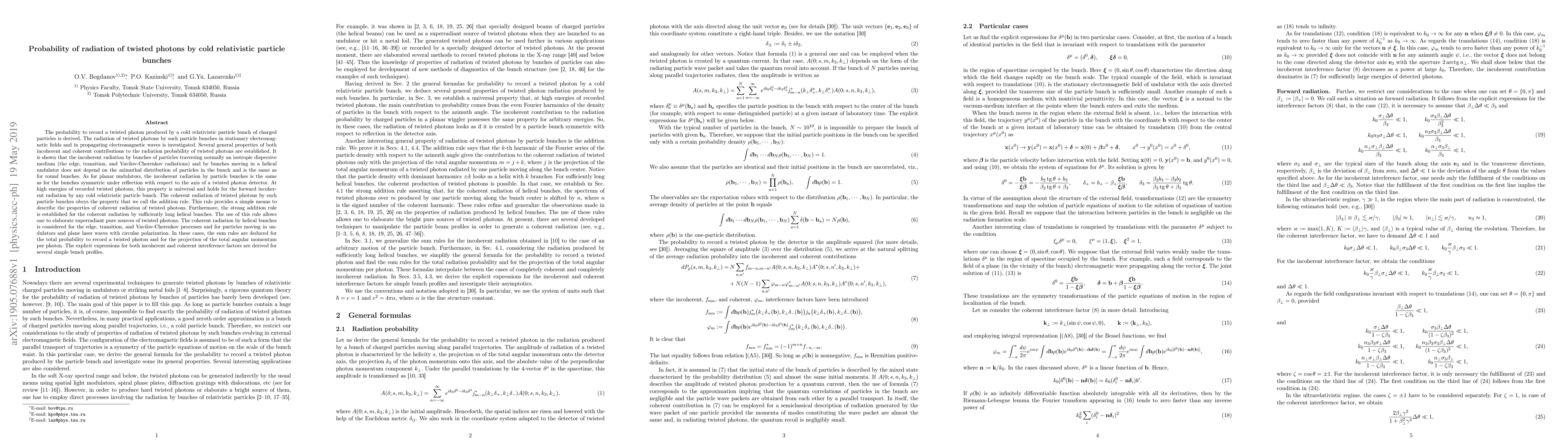 This paper derives the probability of twisted photon radiation by cold relativistic particle bunches, showing that incoherent radiation is independent of particle distribution. It establishes the addition rule for coherent radiation, allowing the development of superradiant sources, and provides explicit expressions for interference factors in various scenarios.