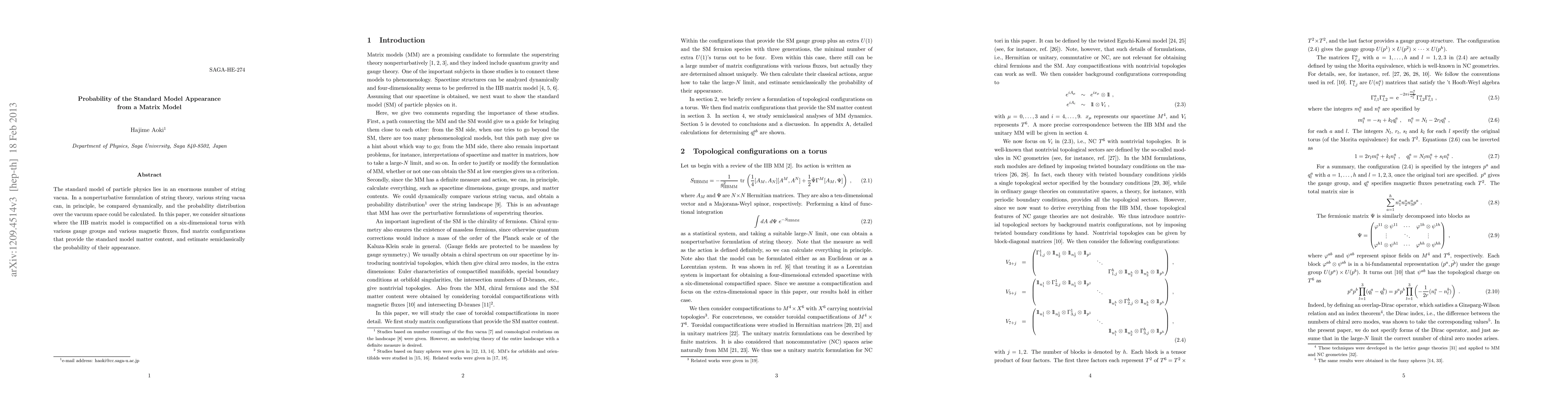The standard model of particle physics lies in an enormous number of string vacua. In a nonperturbative formulation of string theory, various string vacua can, in principle, be compared dynamically, and the probability distribution over the vacuum space could be calculated. In this paper, we consider situations where the IIB matrix model is compactified on a six-dimensional torus with various gauge groups and various magnetic fluxes, find matrix configurations that provide the standard model matter content, and estimate semiclassically the probability of their appearance.