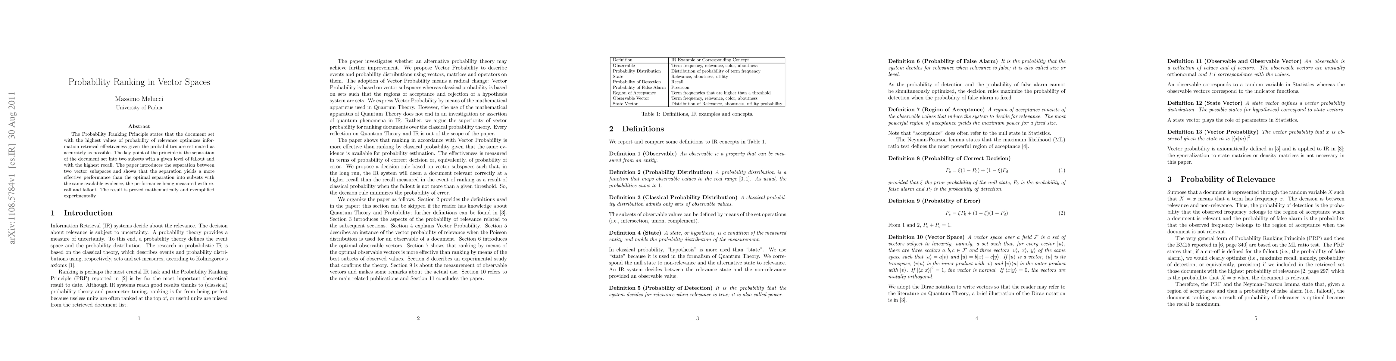 The Probability Ranking Principle states that the document set with the highest values of probability of relevance optimizes information retrieval effectiveness given the probabilities are estimated as accurately as possible. The key point of the principle is the separation of the document set into two subsets with a given level of fallout and with the highest recall. The paper introduces the separation between two vector subspaces and shows that the separation yields a more effective performance than the optimal separation into subsets with the same available evidence, the performance being measured with recall and fallout. The result is proved mathematically and exemplified experimentally.