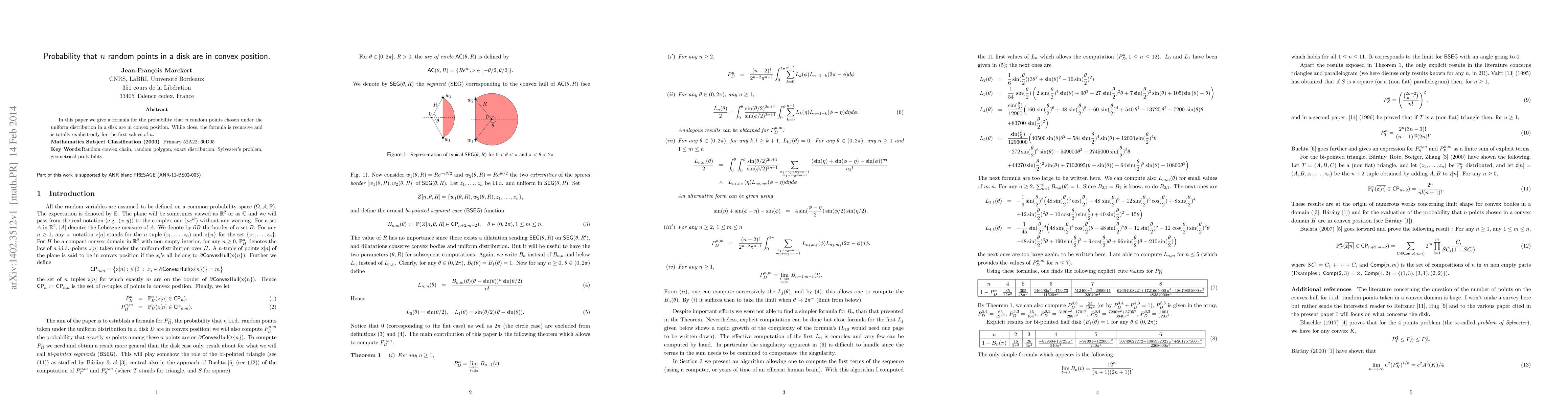 A formula for the probability that n random points in a disk are in convex position has been developed, but it remains recursive and only explicitly solved for small values of n.