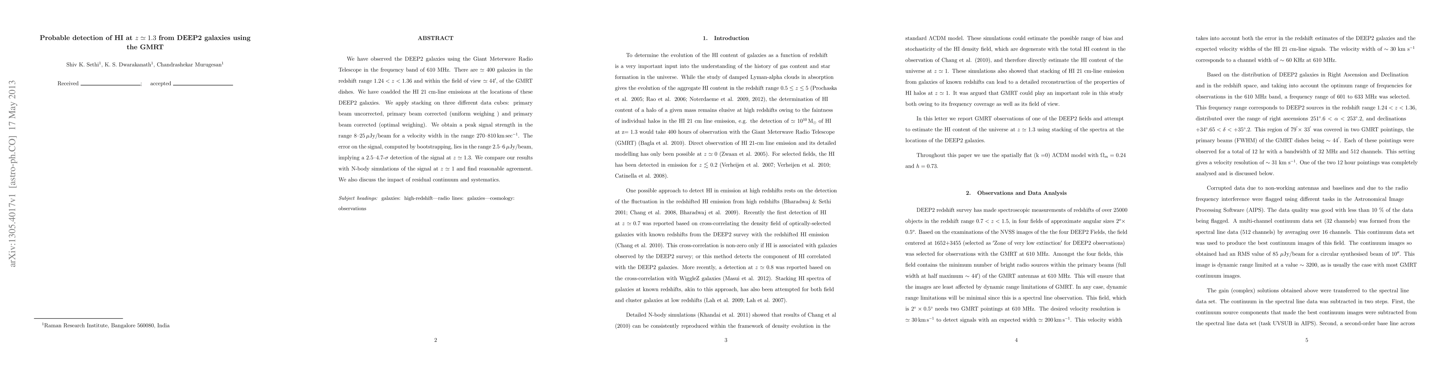We have observed the DEEP2 galaxies using the Giant Meterwave Radio Telescope in the frequency band of 610 MHz. There are $\simeq 400$ galaxies in the redshift range $1.24 < z < 1.36$ and within the field of view $\simeq 44'$, of the GMRT dishes. We have coadded the HI 21 cm-line emissions at the locations of these DEEP2 galaxies. We apply stacking on three different data cubes: primary beam uncorrected, primary beam corrected (uniform weighing ) and primary beam corrected (optimal weighing). We obtain a peak signal strength in the range $8\hbox{--}25 \, \rm \mu$Jy/beam for a velocity width in the range $270\hbox{--} 810 \, \rm km \, sec^{-1}$. The error on the signal, computed by bootstrapping, lies in the range $2.5\hbox{--}6 \, \rm \mu$Jy/beam, implying a 2.5--4.7-$\sigma$ detection of the signal at $z \simeq 1.3$. We compare our results with N-body simulations of the signal at $z\simeq 1$ and find reasonable agreement. We also discuss the impact of residual continuum and systematics.