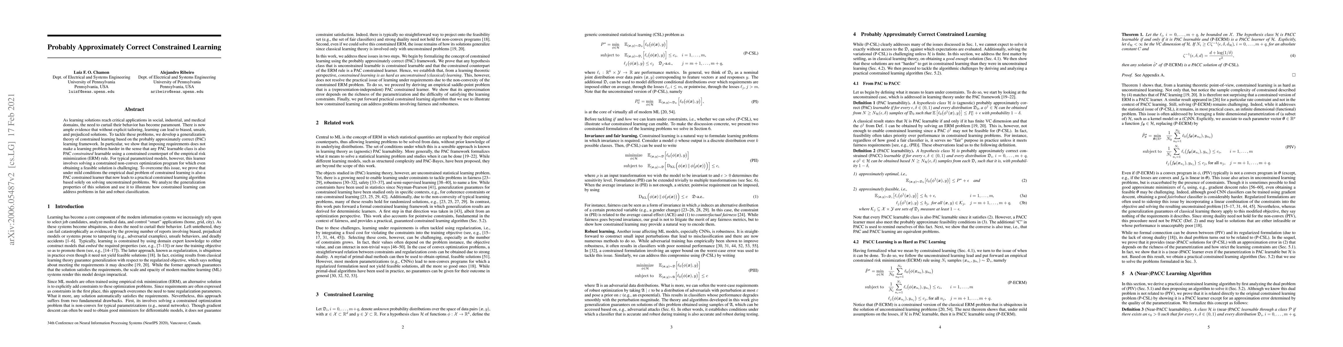This paper develops a constrained learning theory within the PAC framework to address issues of bias and safety in learning solutions. It proposes a practical algorithm based on the empirical dual problem, which simplifies solving constrained non-convex optimization, and demonstrates its application in fair and robust classification.