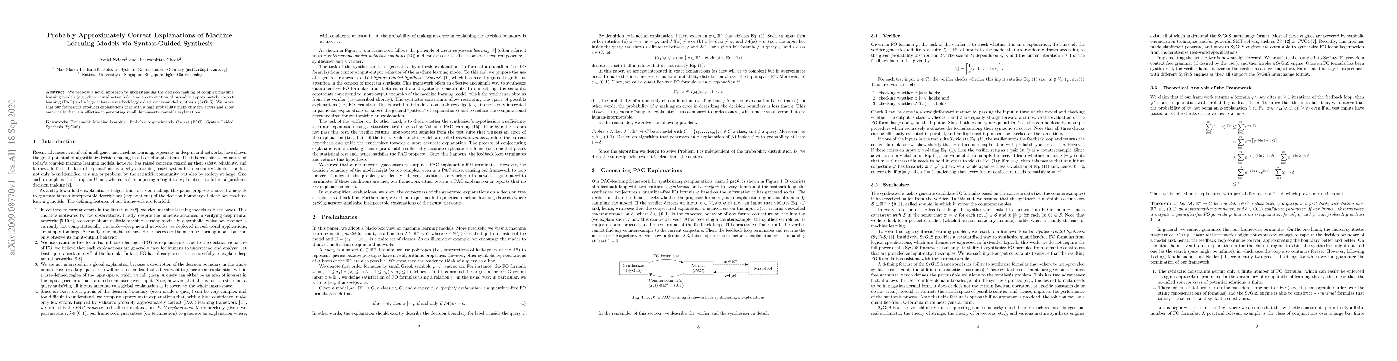 This paper introduces a method combining probably approximately correct learning and syntax-guided synthesis to explain complex machine learning models, proving high-probability accuracy and demonstrating effectiveness in generating small, interpretable explanations.