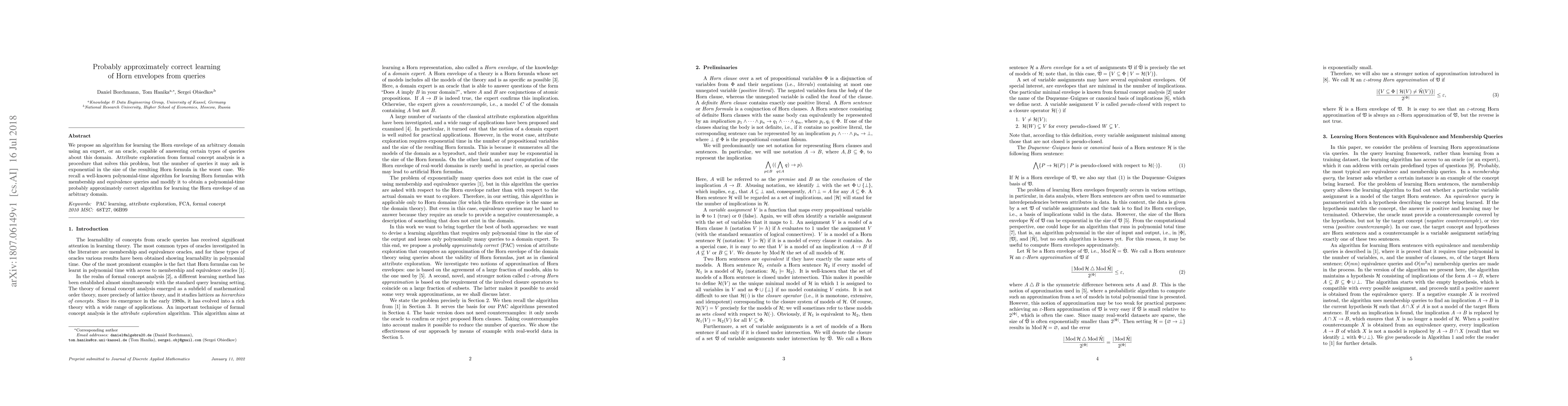 This paper proposes a polynomial-time algorithm for learning the Horn envelope of a domain using queries from an oracle, improving upon existing methods that can require exponential queries. The modified algorithm achieves probably approximately correct learning in polynomial time.