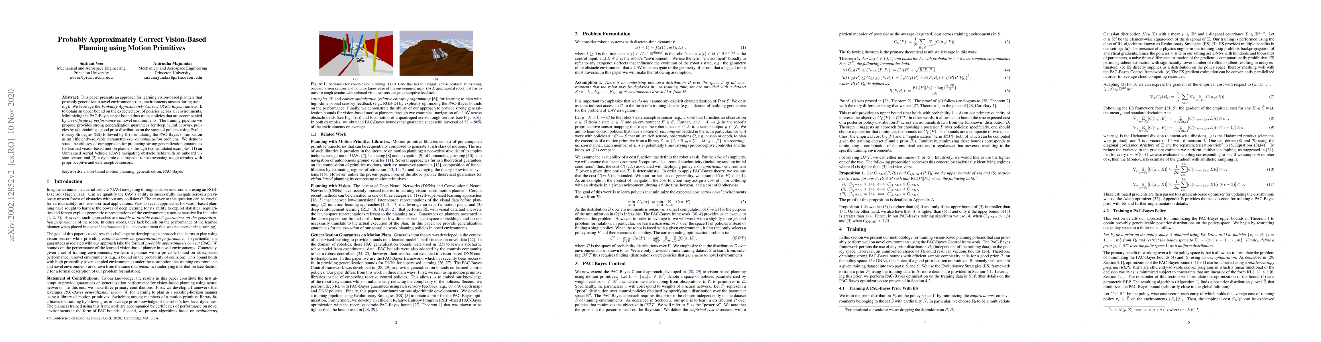 The paper presents an approach for learning vision-based planners that provably generalize to novel environments using the Probably Approximately Correct (PAC)-Bayes framework, combining Evolutionary Strategies (ES) for policy prior and convex optimization for PAC-Bayes optimization.
