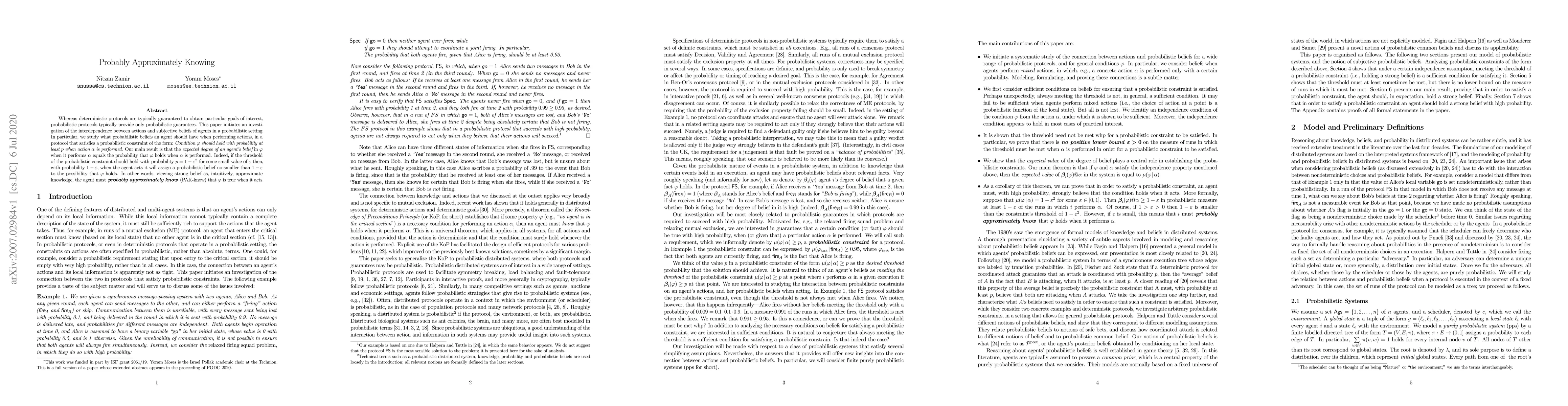 Researchers explore how agents make decisions in probabilistic settings, finding that a strong belief is equivalent to approximately knowing when performing an action. This 'Probably Approximately Knowing' concept ensures the agent will act with confidence in its beliefs.