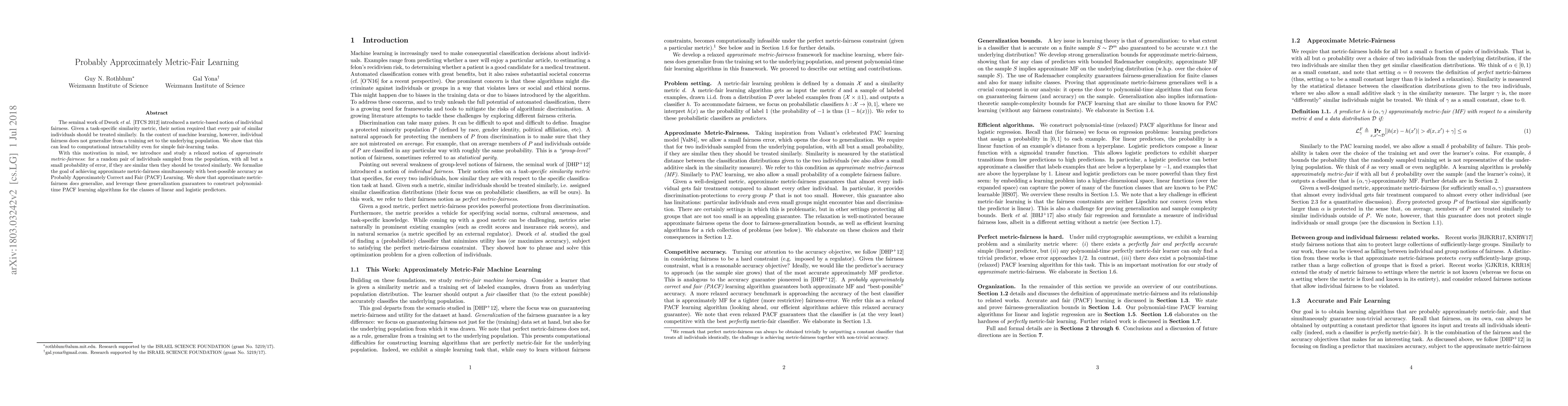 A new approach to fairness in machine learning is proposed, allowing for approximate metric-fairness that generalizes from training data to the population, enabling polynomial-time algorithms for linear and logistic predictors.