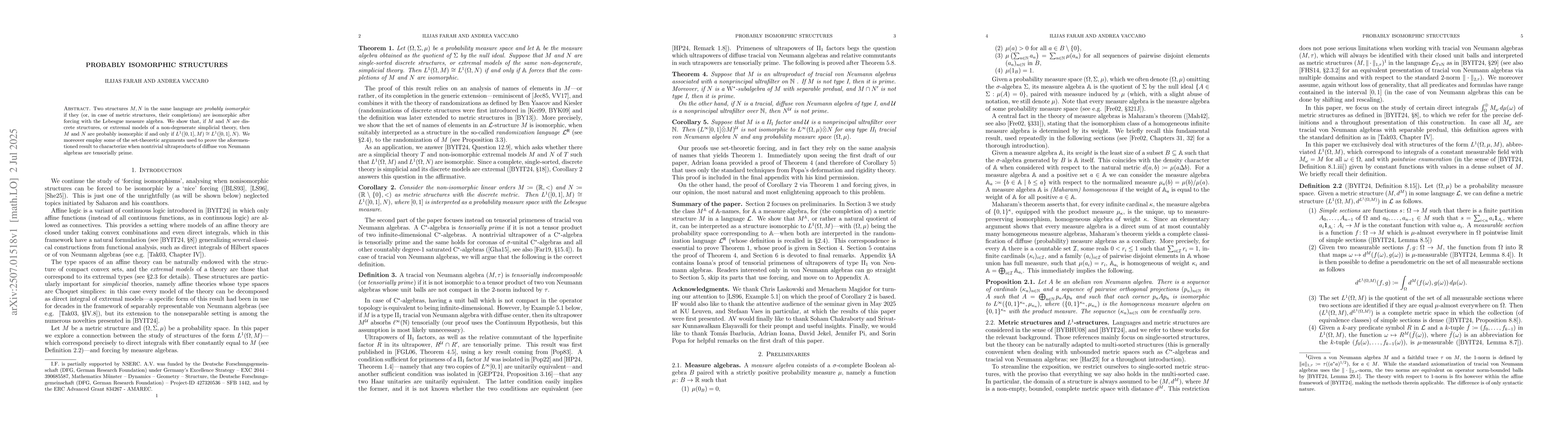 Two structures $M, N$ in the same language are called probably isomorphic if they (or, in case of metric structures, their completions) are isomorphic after forcing with the Lebesgue measure algebra. We show that, if $M$ and $N$ are discrete structures, or extremal models of a non-degenerate simplicial theory, then $M$ and $N$ are probably isomorphic if and only if $L^1([0,1], M) \cong L^1([0,1], N)$. We moreover employ some of the set-theoretic arguments used to prove the aforementioned result to characterize when nontrivial ultraproducts of diffuse von Neumann algebras are tensorially prime.
