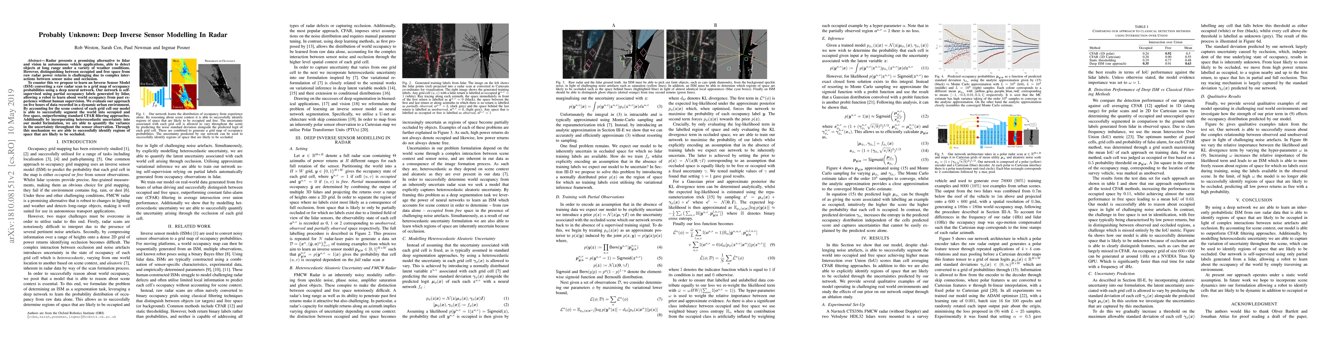 This paper proposes a deep neural network for learning an Inverse Sensor Model (ISM) to convert raw radar scans into occupancy grid maps, enabling autonomous vehicles to distinguish between occupied and free space. The model is self-supervised, leveraging partial occupancy labels from lidar, and outperforms standard filtering methods by incorporating scene context and heteroscedastic uncertainty to identify occluded regions.