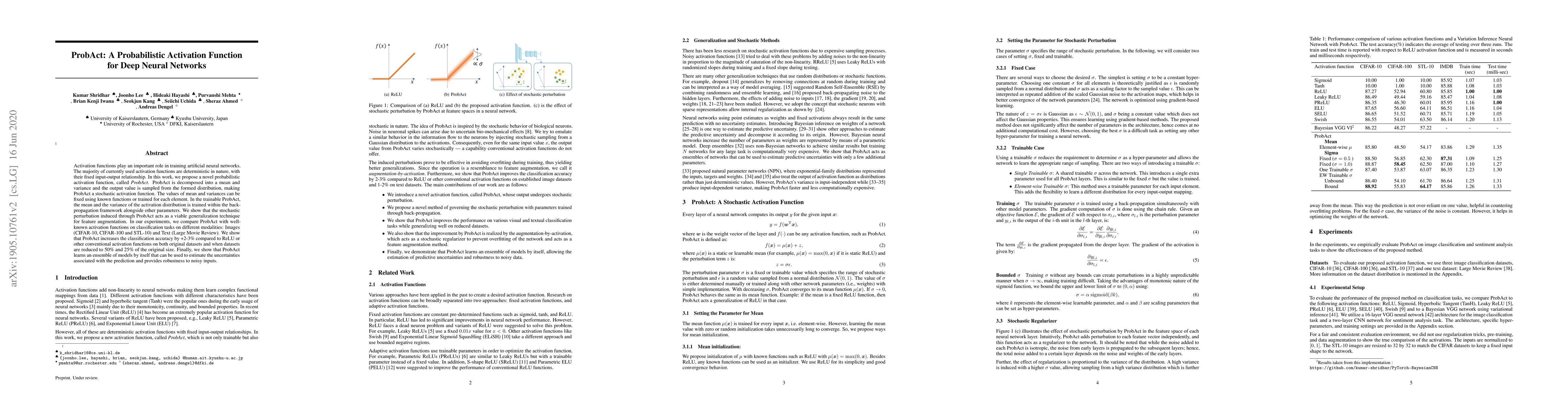 This paper introduces ProbAct, a novel probabilistic activation function for deep neural networks, which samples output values from a distribution with trainable mean and variance. Experiments show that ProbAct enhances classification accuracy by 2-3% compared to conventional functions and provides robustness to noisy data by estimating model uncertainties.