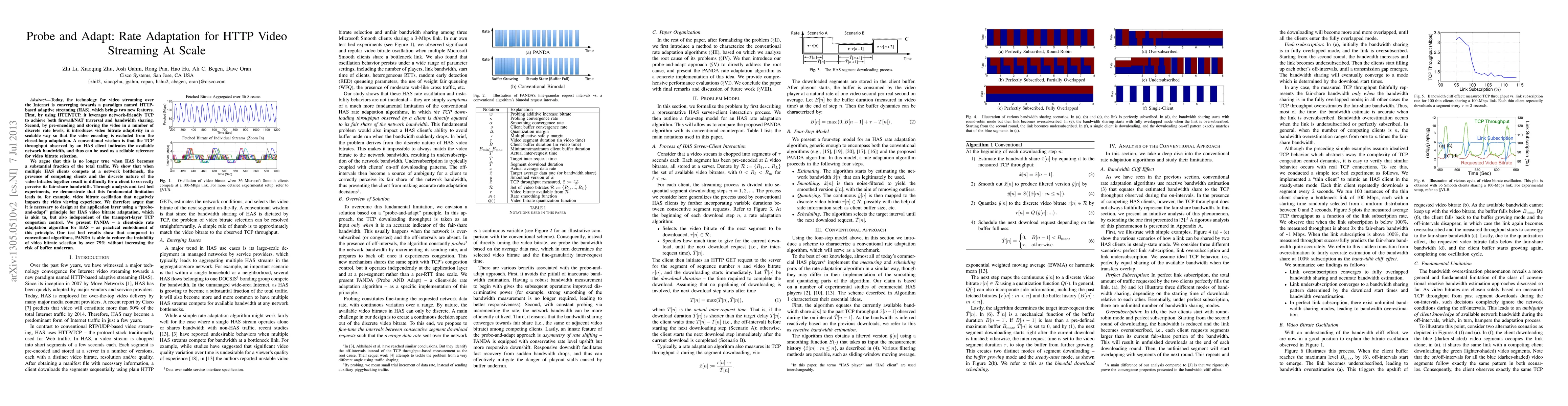 This paper discusses the need for a "probe-and-adapt" mechanism for HTTP-based adaptive streaming (HAS) due to the limitations of relying solely on TCP throughput for bitrate selection. It presents PANDA, a client-side rate adaptation algorithm that reduces video rate instability by 60% compared to conventional methods, addressing issues like video rate oscillation caused by competing clients and discrete bitrate levels.