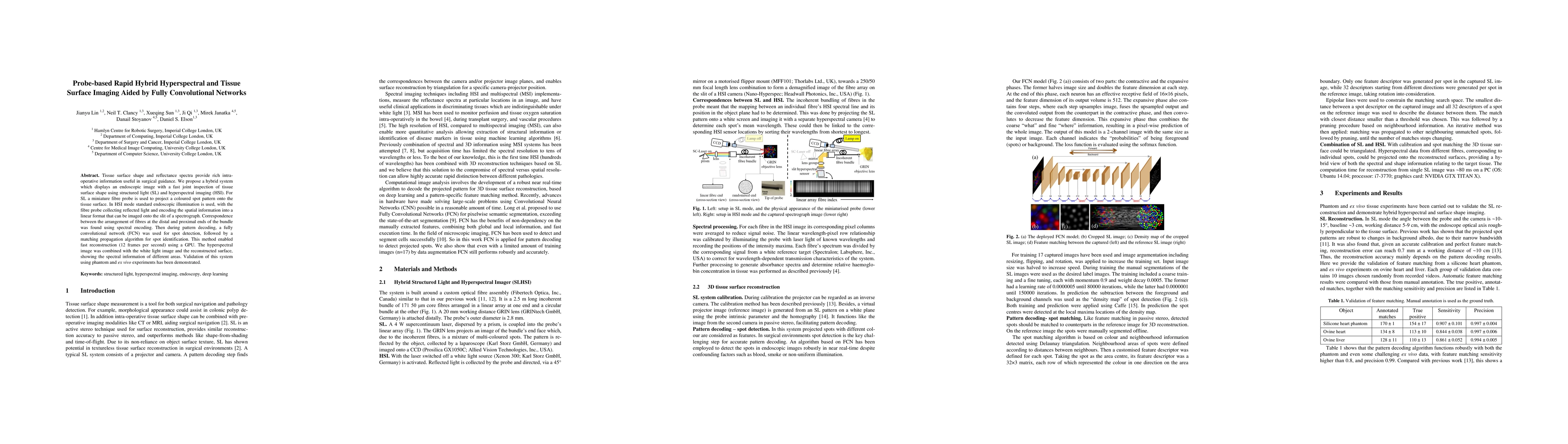 Tissue surface shape and reflectance spectra provide rich intra-operative information useful in surgical guidance. We propose a hybrid system which displays an endoscopic image with a fast joint inspection of tissue surface shape using structured light (SL) and hyperspectral imaging (HSI). For SL a miniature fibre probe is used to project a coloured spot pattern onto the tissue surface. In HSI mode standard endoscopic illumination is used, with the fibre probe collecting reflected light and encoding the spatial information into a linear format that can be imaged onto the slit of a spectrograph. Correspondence between the arrangement of fibres at the distal and proximal ends of the bundle was found using spectral encoding. Then during pattern decoding, a fully convolutional network (FCN) was used for spot detection, followed by a matching propagation algorithm for spot identification. This method enabled fast reconstruction (12 frames per second) using a GPU. The hyperspectral image was combined with the white light image and the reconstructed surface, showing the spectral information of different areas. Validation of this system using phantom and ex vivo experiments has been demonstrated.