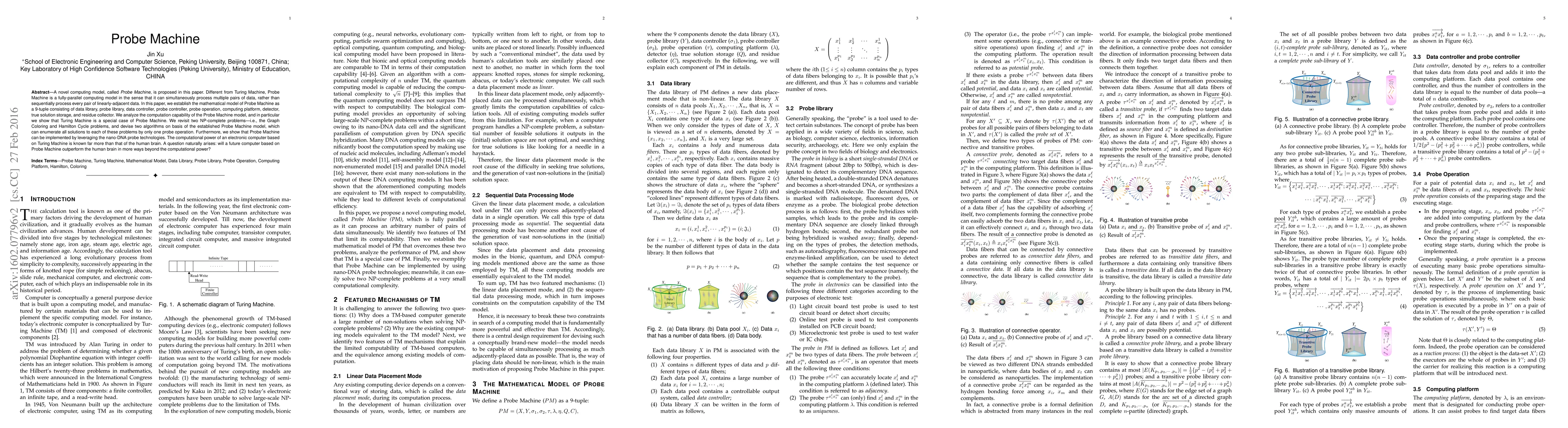 A novel computing model, called \emph{Probe Machine}, is proposed in this paper. Different from Turing Machine, Probe Machine is a fully-parallel computing model in the sense that it can simultaneously process multiple pairs of data, rather than sequentially process every pair of linearly-adjacent data. In this paper, we establish the mathematical model of Probe Machine as a 9-tuple consisting of data library, probe library, data controller, probe controller, probe operation, computing platform, detector, true solution storage, and residue collector. We analyze the computation capability of the Probe Machine model, and in particular we show that Turing Machine is a special case of Probe Machine. We revisit two NP-complete problems---i.e., the Graph Coloring and Hamilton Cycle problems, and devise two algorithms on basis of the established Probe Machine model, which can enumerate all solutions to each of these problems by only one probe operation. Furthermore, we show that Probe Machine can be implemented by leveraging the nano-DNA probe technologies. The computational power of an electronic computer based on Turing Machine is known far more than that of the human brain. A question naturally arises: will a future computer based on Probe Machine outperform the human brain in more ways beyond the computational power?