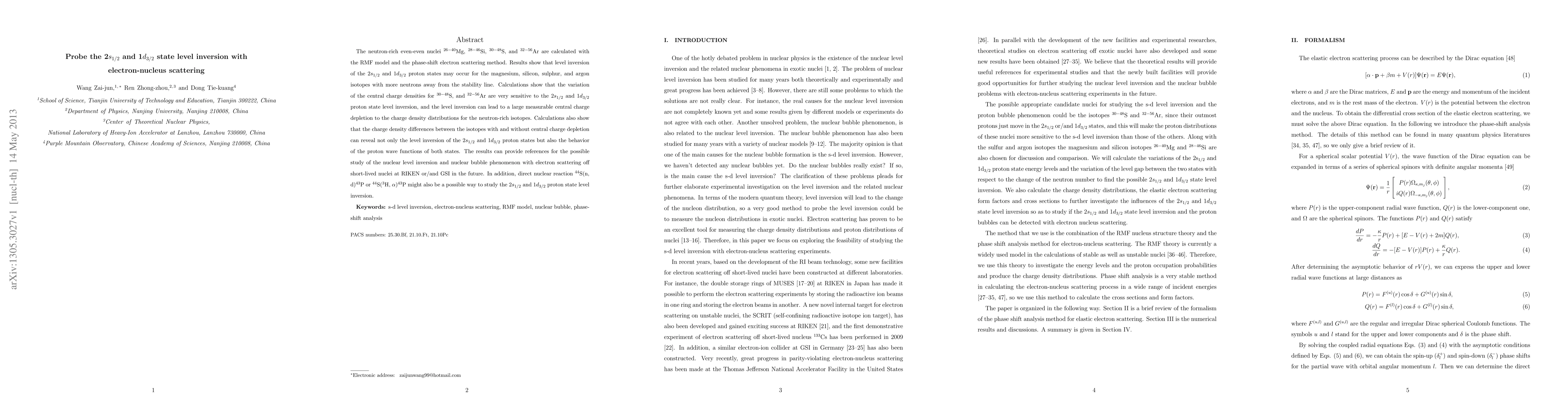 The neutron-rich even-even nuclei $^{26-40}$Mg, $^{28-46}$Si, $^{30-48}$S, and $^{32-56}$Ar are calculated with the RMF model and the phase-shift electron scattering method. Results show that level inversion of the 2$s_{1/2}$ and 1$d_{3/2}$ proton states may occur for the magnesium, silicon, sulphur, and argon isotopes with more neutrons away from the stability line. Calculations show that the variation of the central charge densities for $^{30-48}$S, and $^{32-56}$Ar are very sensitive to the 2$s_{1/2}$ and 1$d_{3/2}$ proton state level inversion, and the level inversion can lead to a large measurable central charge depletion to the charge density distributions for the neutron-rich isotopes. Calculations also show that the charge density differences between the isotopes with and without central charge depletion can reveal not only the level inversion of the 2$s_{1/2}$ and 1$d_{3/2}$ proton states but also the behavior of the proton wave functions of both states. The results can provide references for the possible study of the nuclear level inversion and nuclear bubble phenomenon with electron scattering off short-lived nuclei at RIKEN or/and GSI in the future. In addition, direct nuclear reaction $^{44}$S(n, d)$^{43}$P or $^{44}$S($^{3}$H, $\alpha$)$^{43}$P might also be a possible way to study the 2$s_{1/2}$ and 1$d_{3/2}$ proton state level inversion.