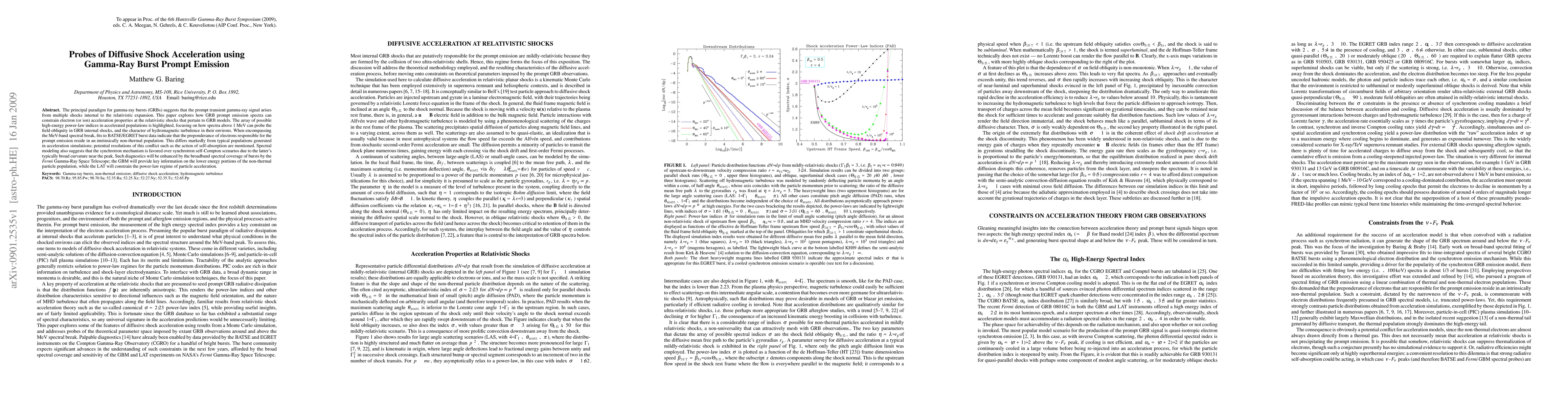 This paper investigates how gamma-ray burst (GRB) prompt emission spectra can reveal properties of electron or ion acceleration at relativistic shocks, emphasizing the MeV-band spectral break. It suggests that the Fermi Gamma-Ray Space Telescope will enhance diagnostics, with the GBM and LAT providing crucial data on particle populations and acceleration mechanisms.