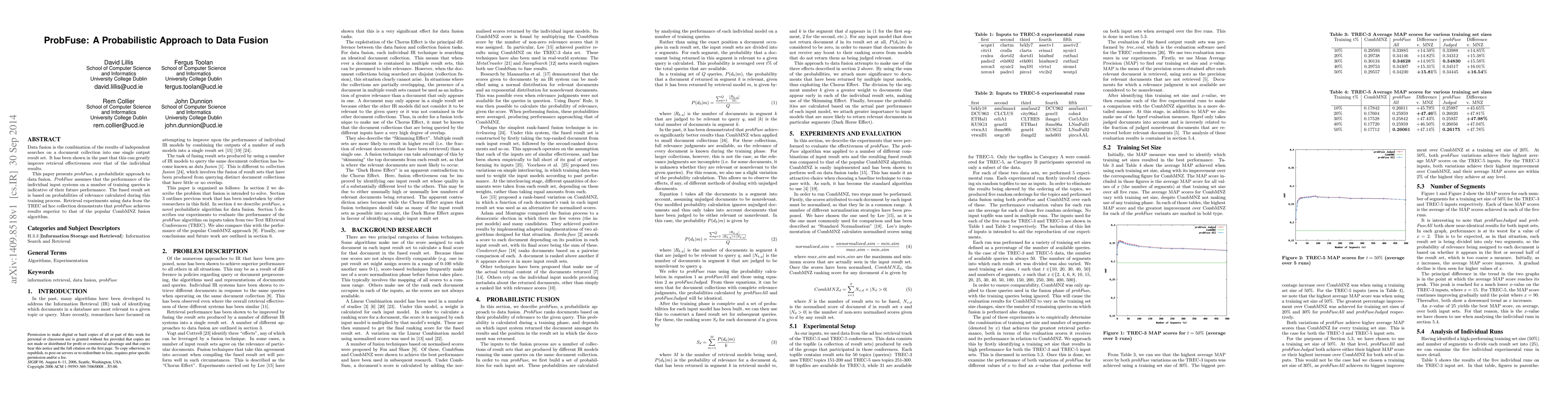 A new probabilistic approach called probFuse is proposed to improve data fusion results, outperforming a popular existing algorithm in retrieval effectiveness. This method uses training queries to predict future performance of individual systems.