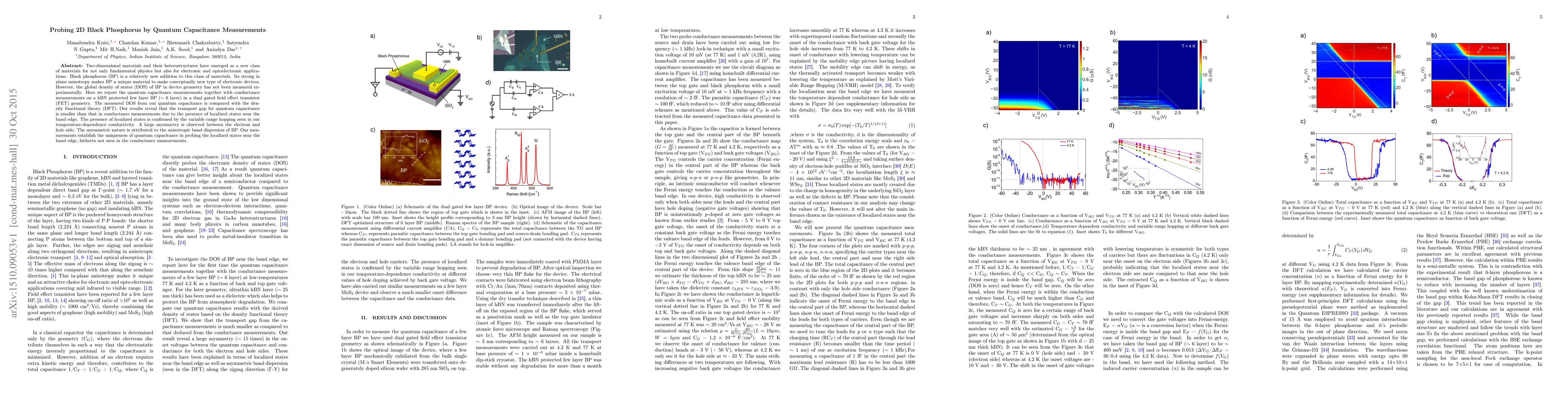 This paper reports quantum capacitance measurements on few-layer black phosphorus in a dual gated FET, revealing a transport gap smaller than conductance measurements due to localized states near the band edge, confirmed by variable range hopping. The asymmetric electron-hole behavior is attributed to the material's anisotropic band dispersion.
