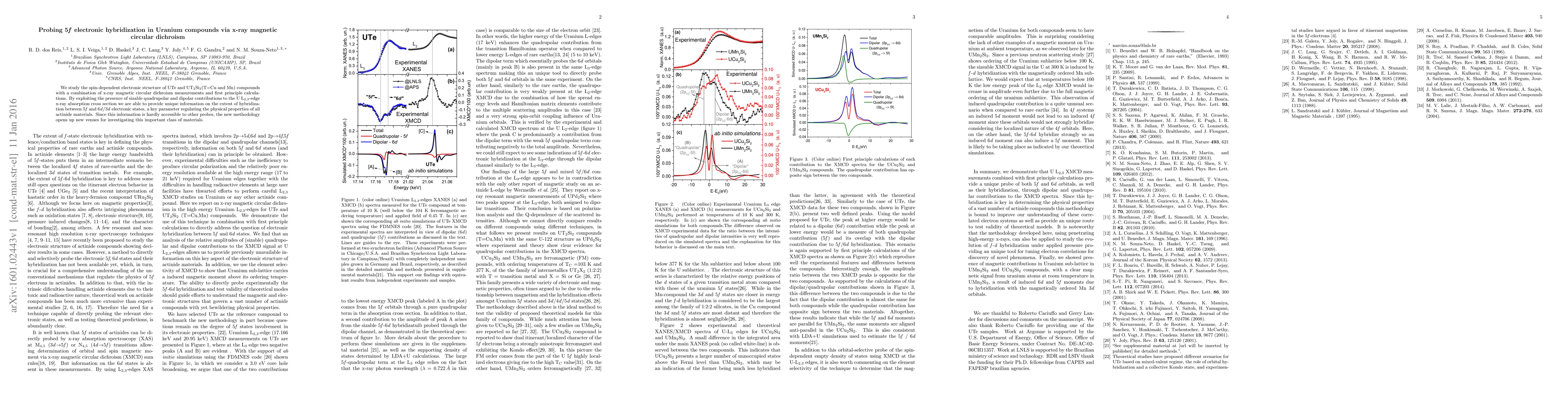 We study the spin-dependent electronic structure of UTe and UT_{2}Si_{2} (T=Cu and Mn) compounds with a combination of x-ray magnetic circular dichroism measurements and first principle calculations. By exploiting the presence of sizable quadrupolar and dipolar contributions to the U L_{2,3}-edge x-ray absorption cross section we are able to provide unique information on the extent of hybridization between 5f and 6d/3d electronic states, a key parameter regulating the physical properties of all actinide materials. Since this information is hardly accessible to other probes, the new methodology opens up new venues for investigating this important class of materials.