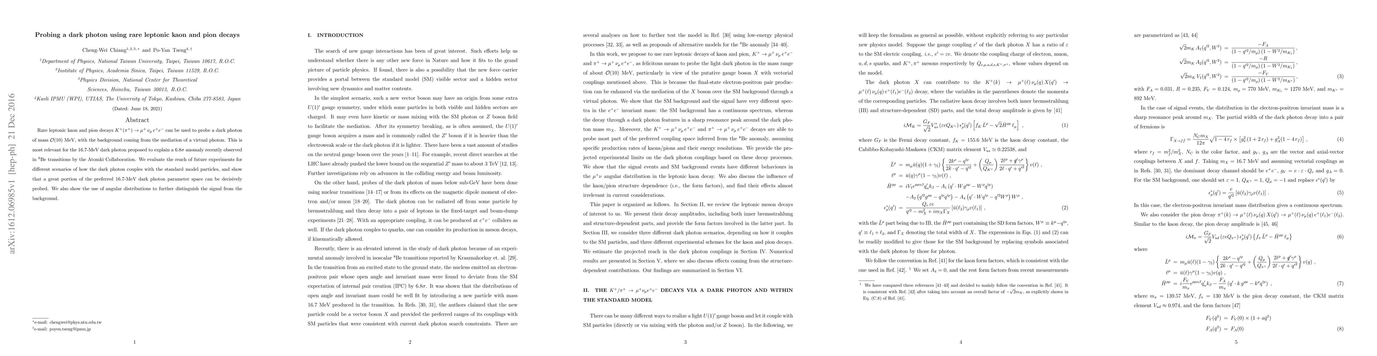 This paper investigates the potential of rare leptonic kaon and pion decays to detect a dark photon with a mass around 16.7 MeV, which could explain recent anomalies in beryllium transitions. It evaluates the reach of future experiments and suggests that angular distributions can help distinguish the signal from background.
