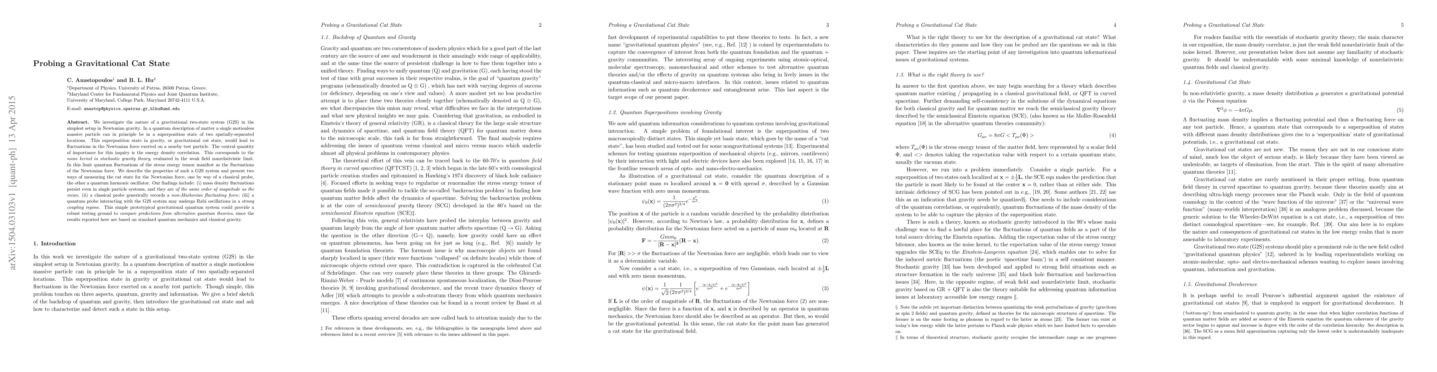 Researchers investigate a 'gravitational cat state' where a single particle can exist in two locations at once, leading to fluctuations in the force exerted on nearby objects. The study finds mass density fluctuations persist even in single-particle systems and proposes methods for measuring these effects using classical and quantum probes.