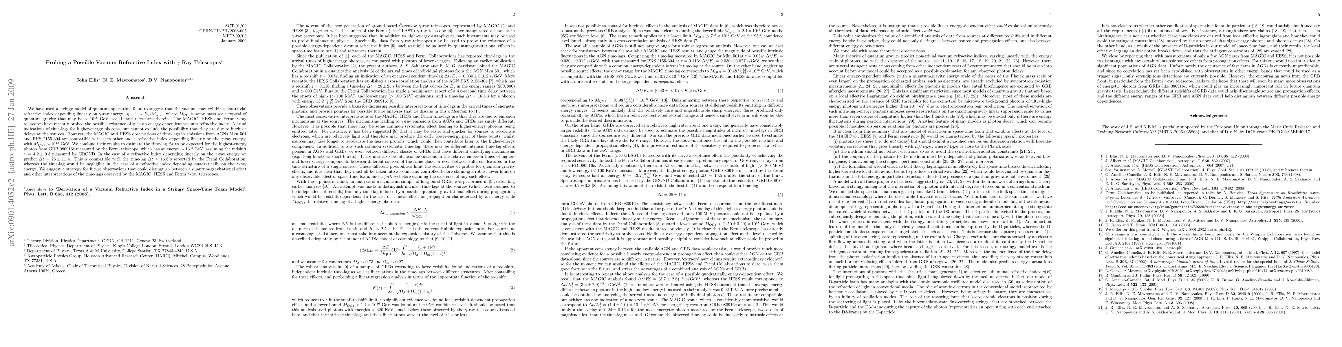 We have used a stringy model of quantum space-time foam to suggest that the vacuum may exhibit a non-trivial refractive index depending linearly on gamma-ray energy: eta -1 ~ E_gamma/M_QG1, where M_QG1 is some mass scale typical of quantum gravity that may be ~ 10^18 GeV: see Phys. Lett. B 665, 412 (2008) and references therein. The MAGIC, HESS and Fermi gamma-ray telescopes have recently probed the possible existence of such an energy-dependent vacuum refractive index. All find indications of time-lags for higher-energy photons, but cannot exclude the possibility that they are due to intrinsic delays at the sources. However, the MAGIC and HESS observations of time-lags in emissions from AGNs Mkn 501 and PKS 2155-304 are compatible with each other and a refractive index depending linearly on the gamma-ray energy, with M_QG1 ~ 10^18 GeV. We combine their results to estimate the time-lag Delta t to be expected for the highest-energy photon from GRB 080916c measured by the Fermi telescope, which has an energy ~ 13.2 GeV, assuming the redshift z = 4.2 \pm 0.3 measured by GROND. In the case of a refractive index depending linearly on the gamma-ray energy we predict Delta t = 25 \pm 11 s. This is compatible with the time-lag Delta t <= 16.5 s reported by the Fermi Collaboration, whereas the time-lag would be negligible in the case of a refractive index depending quadratically on the gamma-ray energy. We suggest a strategy for future observations that could distinguish between a quantum-gravitational effect and other interpretations of the time-lags observed by the MAGIC, HESS and Fermi gamma-ray telescopes.